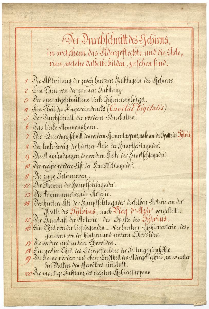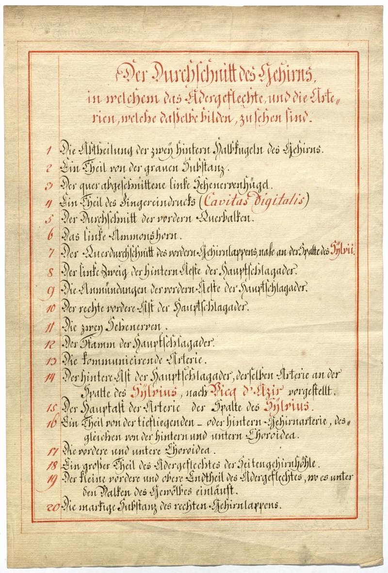 Der Text ist die ergänzende Beschreibung in deutscher Sprache zum anatomischen Wachsmodell des Gehirns. Das Präparat und die kolorierte Zeichnung fehlen.