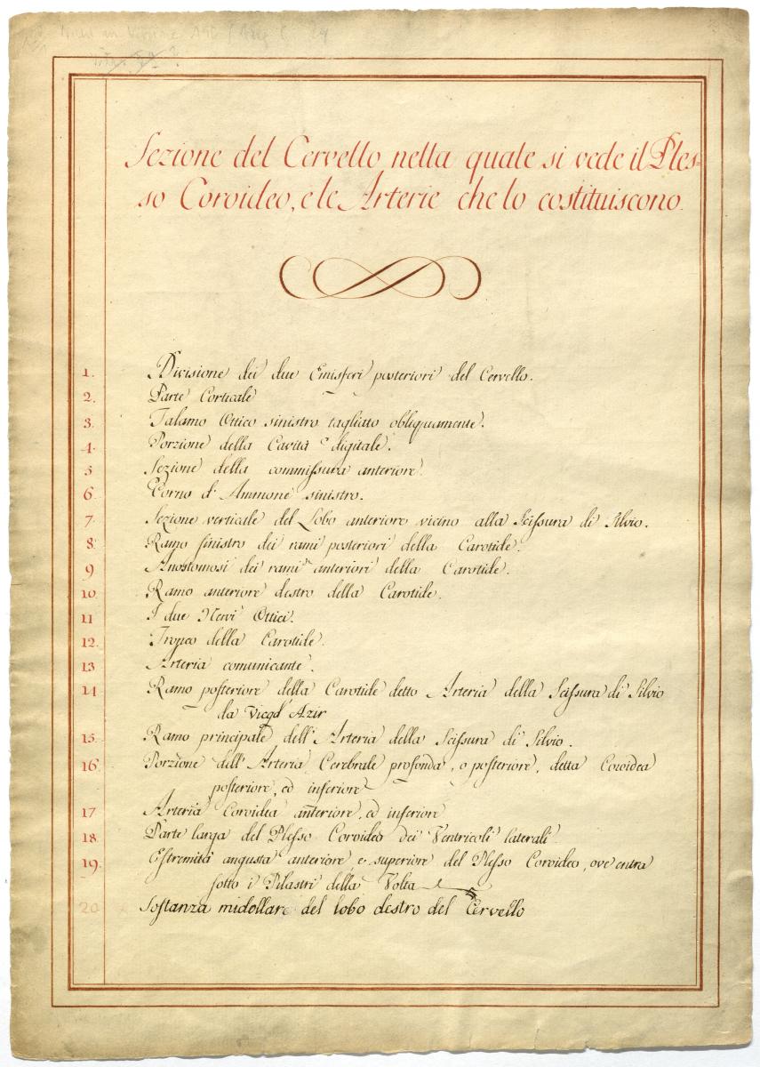 Der Text ist die ergänzende Beschreibung in italienischer Sprache zum anatomischen Wachsmodell des Gehirns. Das Präparat und die kolorierte Zeichnung fehlen.