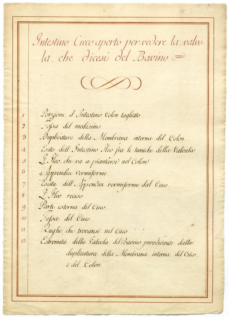 Der Text ist die ergänzende Beschreibung in italienischer Sprache zum anatomischen Wachsmodell des Ileocaecalen Übergangs (Übergang zwischen Dünn- und Dickdarm).