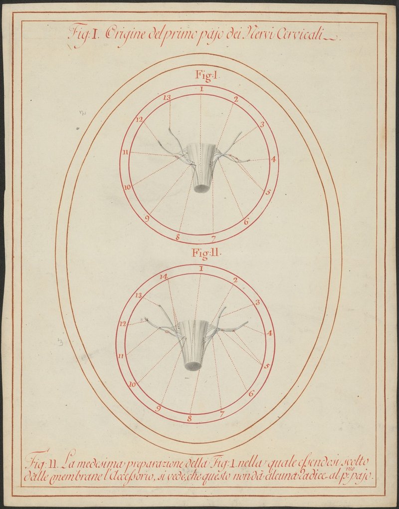 Fig. 1: 276/2: Der erste Spinalnerv (Nervus spinalis cervicalis I.) und die spinale Wurzel des 11. Hirnnerven (Nervus accessorius). Fig. 2: 276/3: Verbindungsfasern zwischen den spinalen Wurzeln des 11. Hirnnerven (Nervus accessorius) und dem ersten Spinalnerven (Nervus spinalis cervicalis I.) mit gegenüber dem vorhergehenden Modell etwas abweichendem Faserverlauf.
