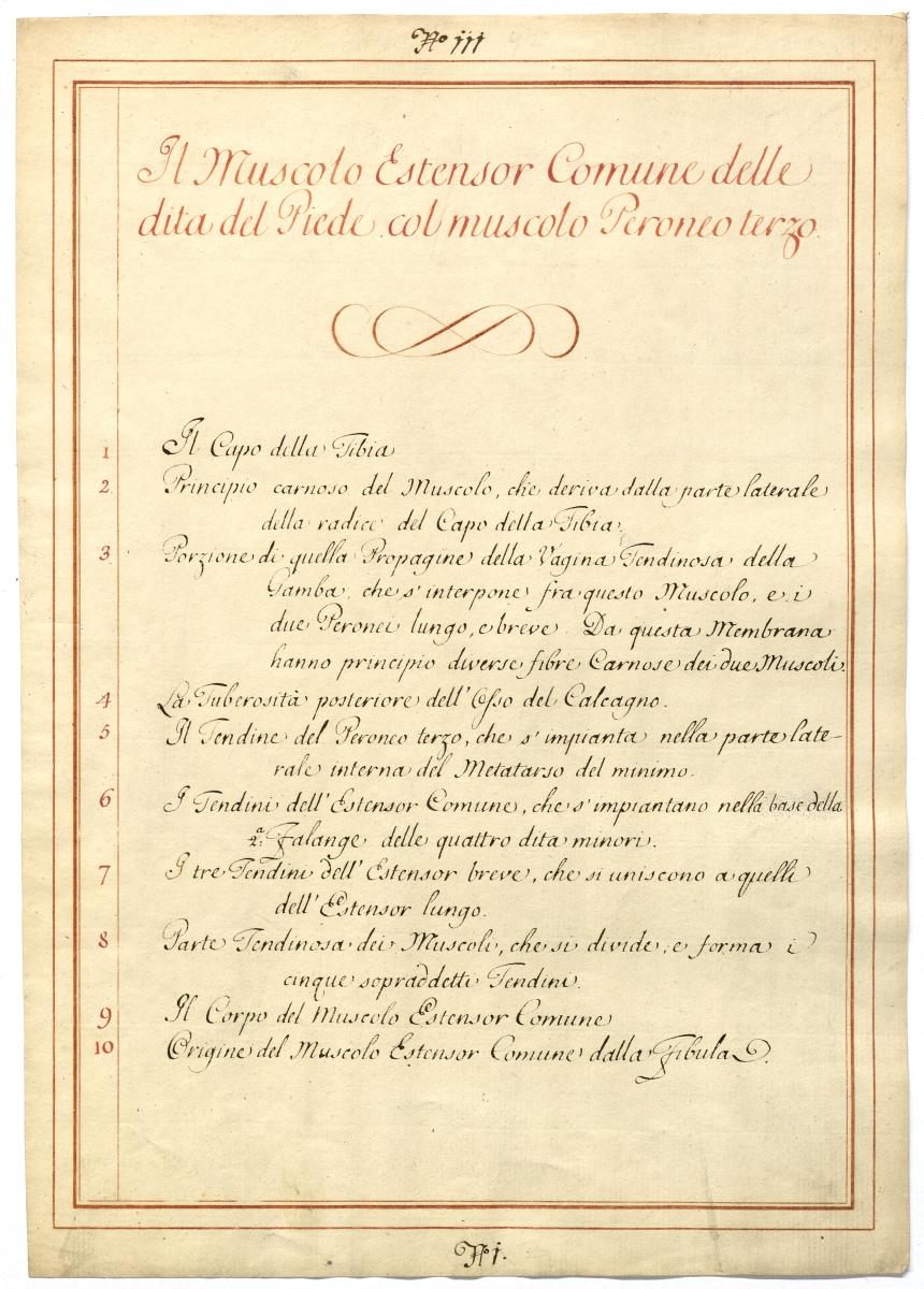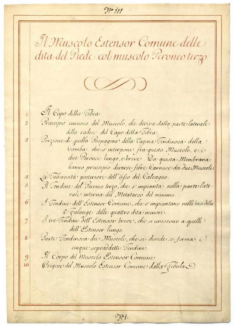 Der Text ist die ergänzende Beschreibung in italienischer Sprache zum anatomischen Wachsmodell der Muskeln der Großzehe.