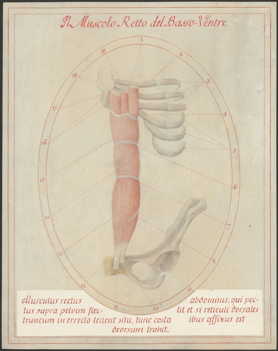 Unteres Drittel des Brustbeinkörpers (Corpus sterni) mit Schwertfortsatz (Processus xiphoideus) mit den Rippen 5-9 der linken Seite sowie linker Beckenknochen (Os coxae) mit Schambeinfuge (Symphysis pubica). Musculus rectus abdominis („Six-pack-Muskel“).