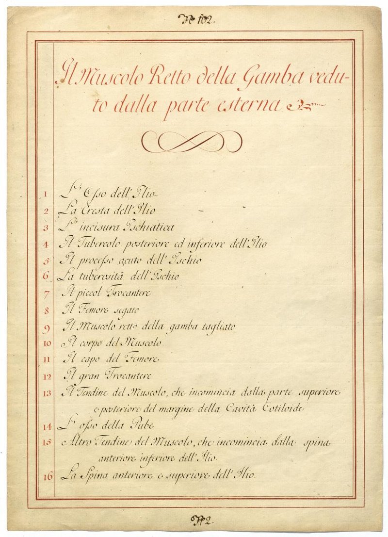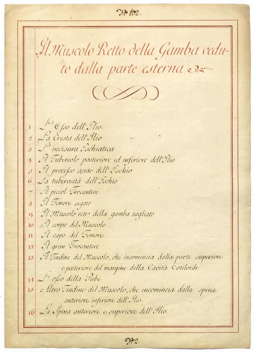 Der Text ist die ergänzende Beschreibung in italienischer Sprache zum anatomischen Wachsmodell der Muskeln der Oberschenkel-Streck- und Beugeseite.