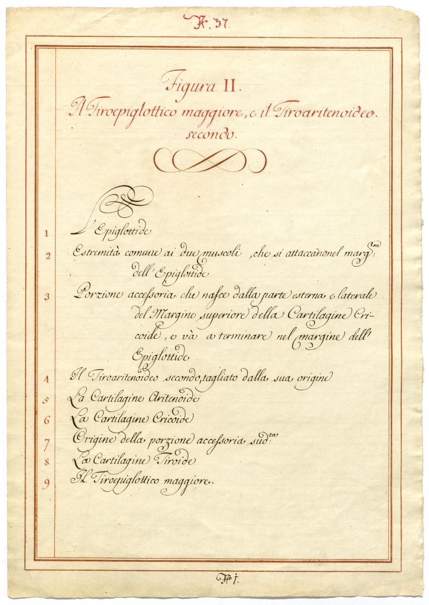 Der Text ist die ergänzende Beschreibung in italienischer Sprache zum anatomischen Wachsmodell der Kehlkopfmuskulatur.