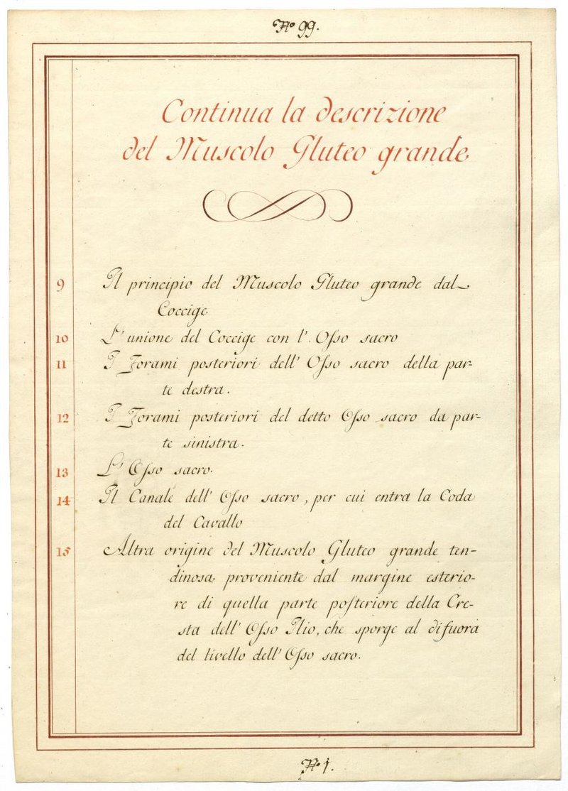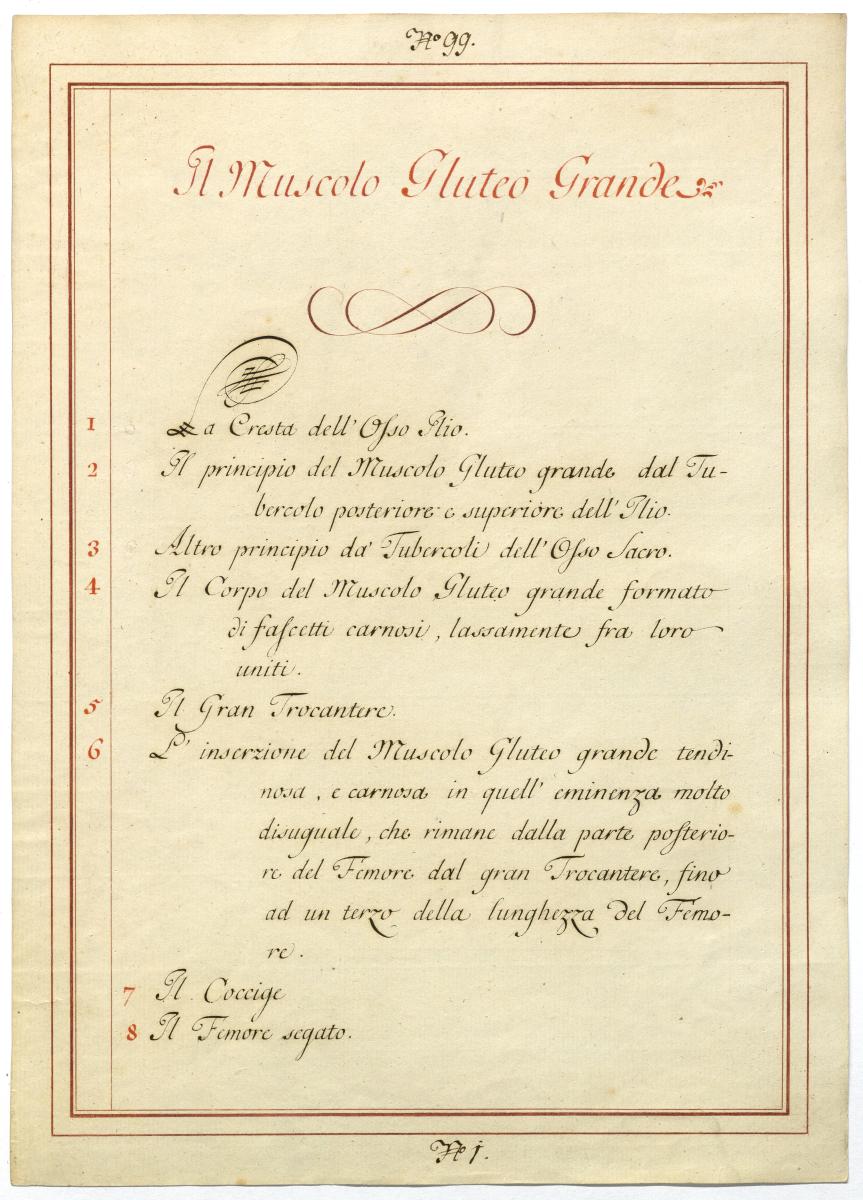 Der Text ist die ergänzende Beschreibung in italienischer Sprache zum anatomischen Wachsmodell der Hüftmuskulatur.