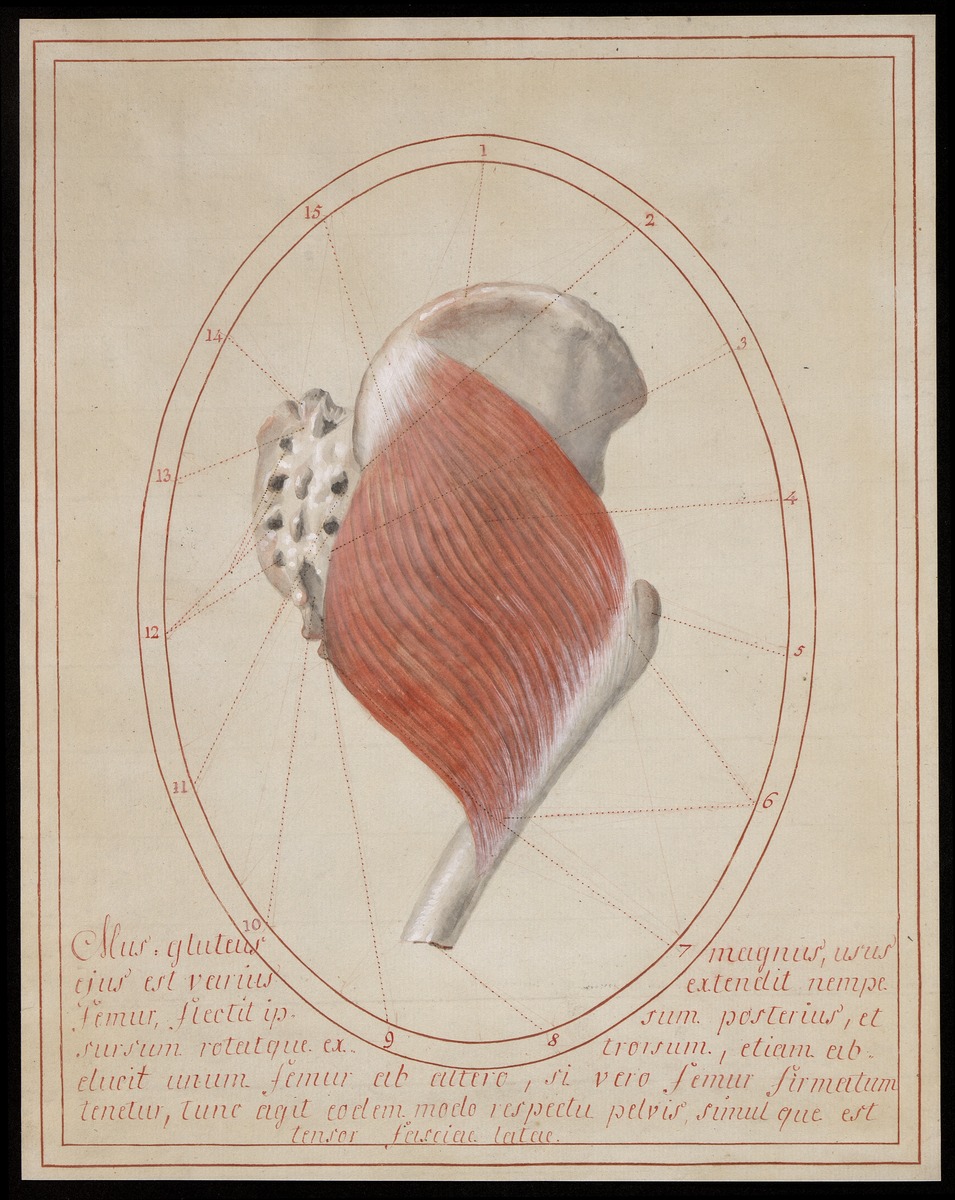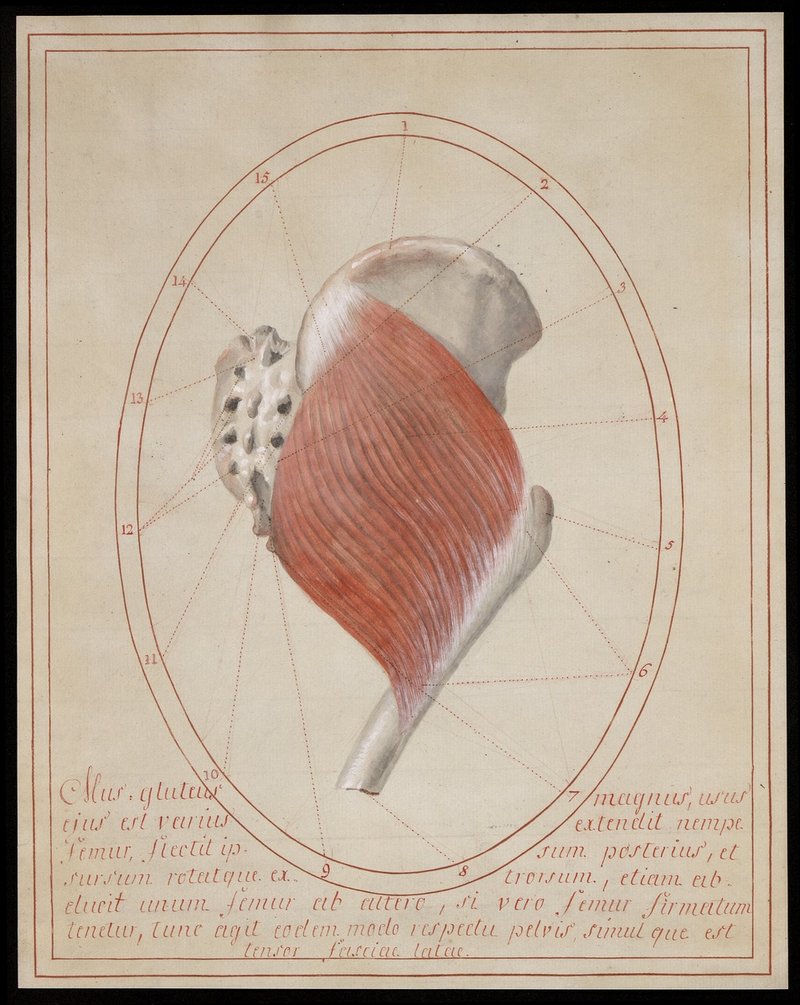 Rechter Beckenknochen, rechte Kreuzbeinhälfte und rechter proximaler Oberschenkelknochen (Femur) von hinten. Musculus glutaeus maximus.