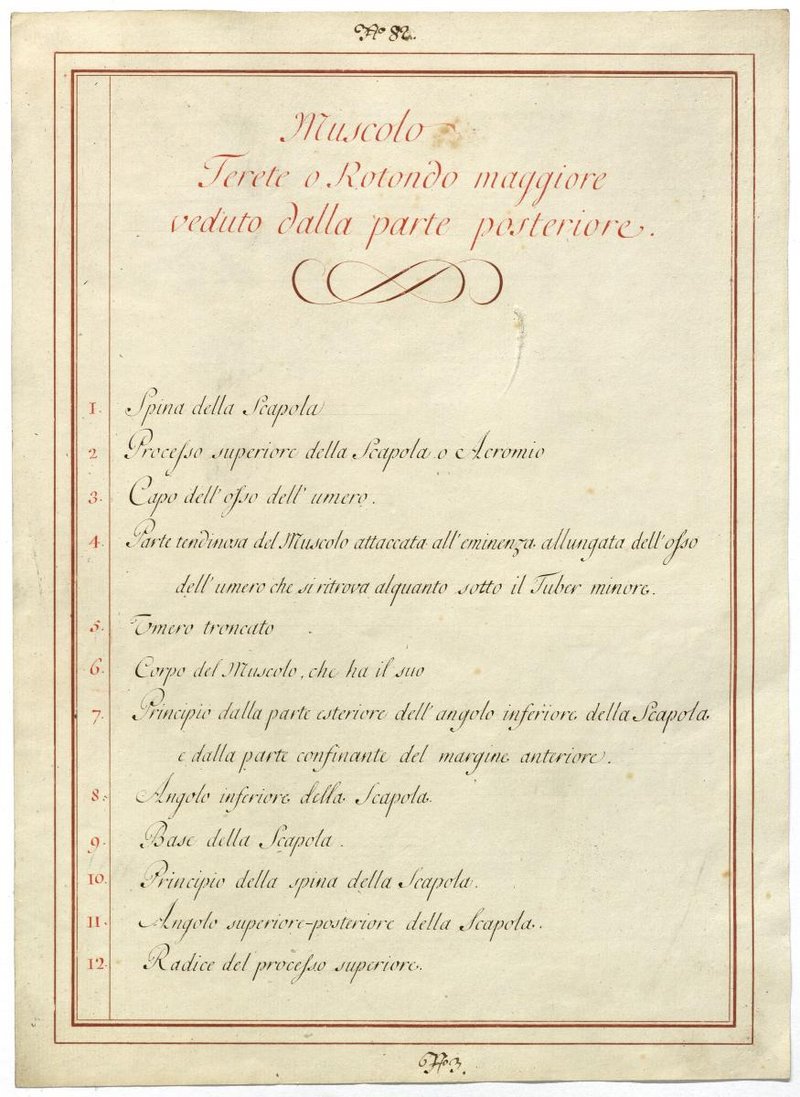Der Text ist die ergänzende Beschreibung in italienischer Sprache zum anatomischen Wachsmodell der Schultergürtelmuskulatur.