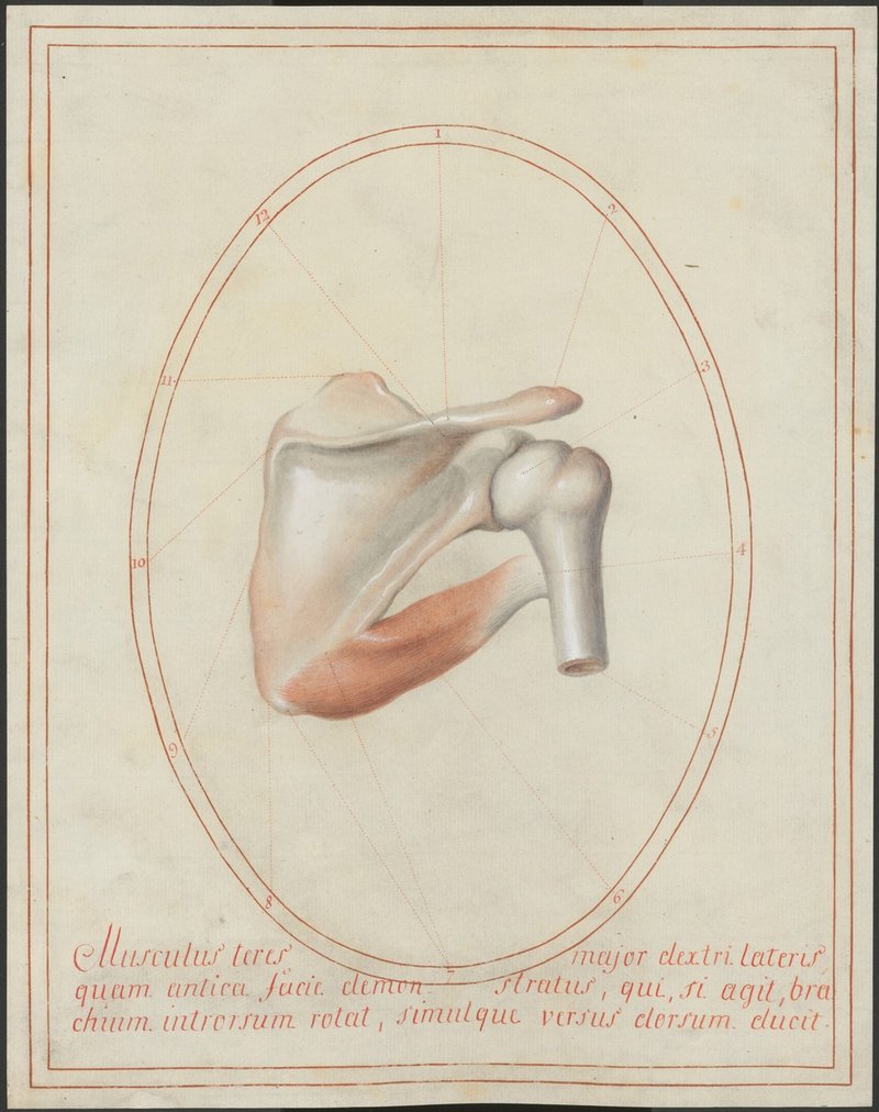 Schulterblatt (Scapula) und proximaler Oberarmknochen (Humerus) der rechten Seite von hinten. Musculus teres major.