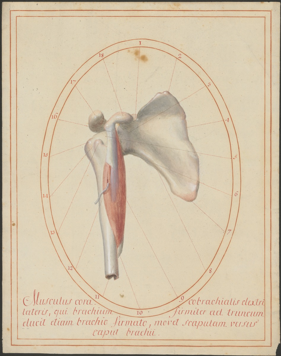 Schulterblatt (Scapula) und proximaler Oberarmknochen (Humerus) der rechten Seite von vorne. Musculus coracobrachialis mit Nervus musculocutaneus.
