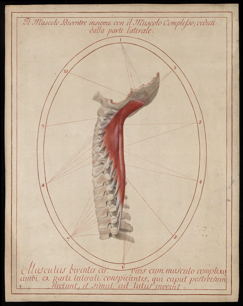 Isoliertes Modell des Hinterhauptbein (Os occipitale), der sieben Halswirbeln und der ersten sieben Brustwirbel von der Seite. Linker Musculus semispinalis capitis.