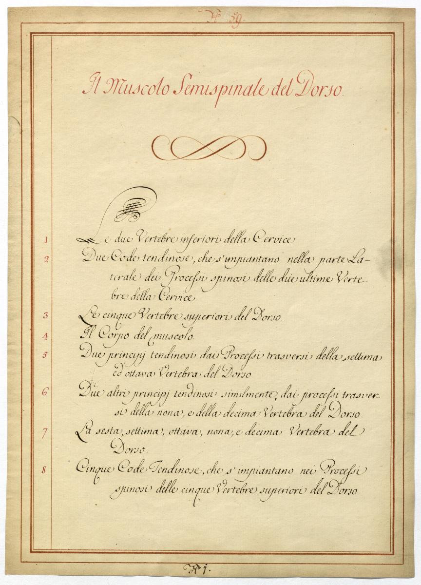 Der Text ist die ergänzende Beschreibung in italienischer Sprache zum anatomischen Wachsmodell der autochthonen Rückenmuskeln.