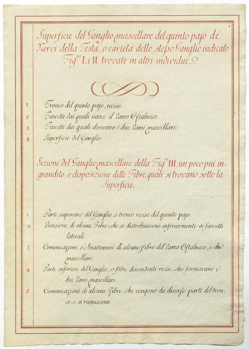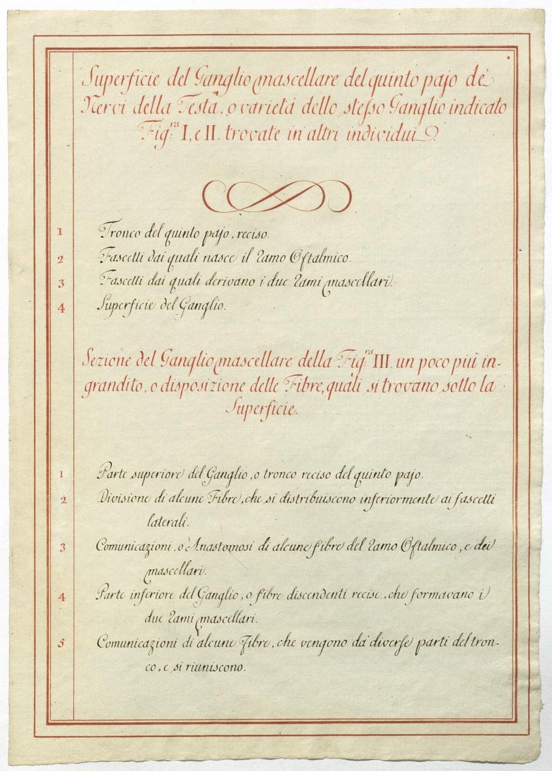 Der Text ist die ergänzende Beschreibung in italienischer Sprache zum anatomischen Wachsmodell der Nervenbildungen.
