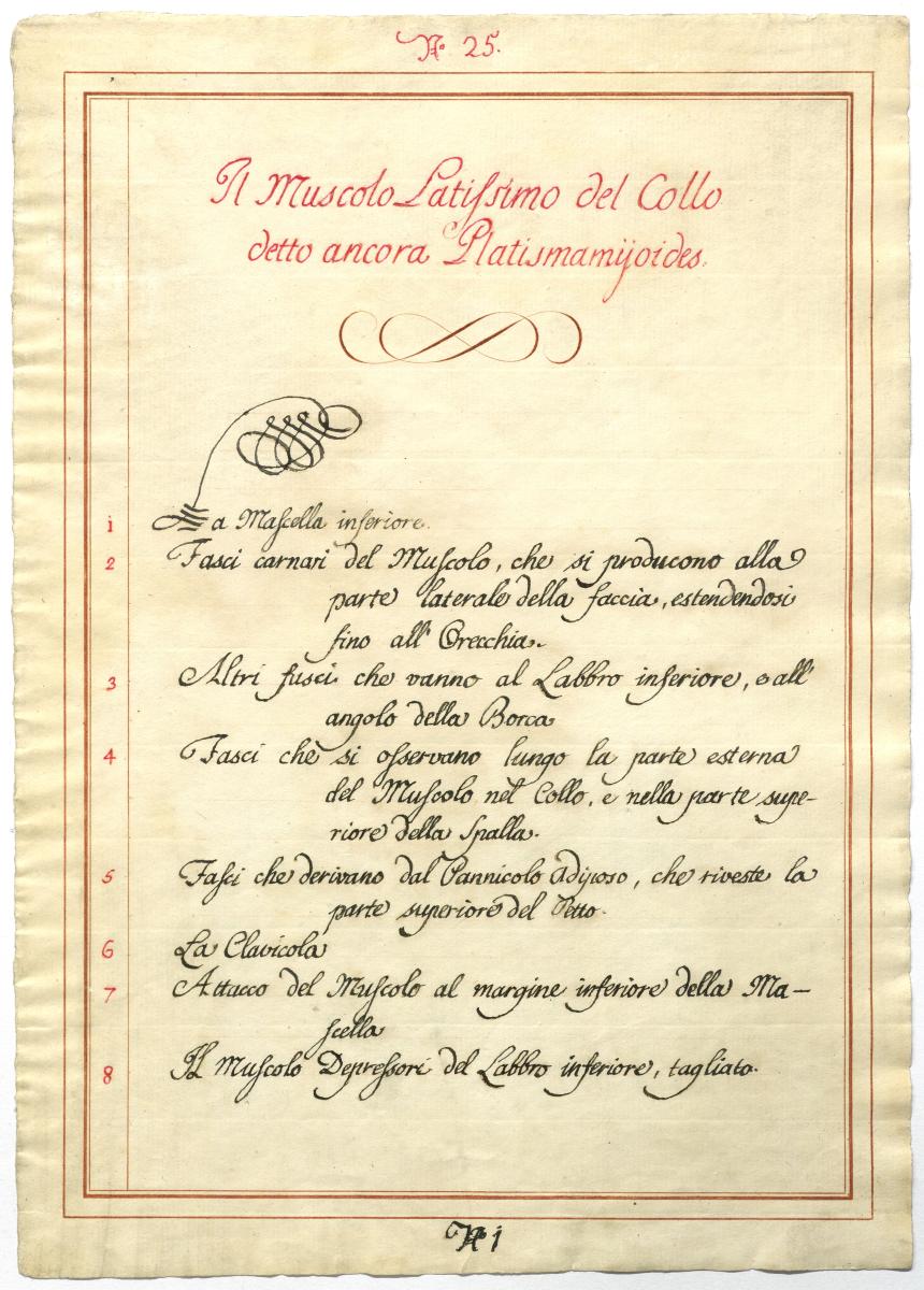 Der Text ist die ergänzende Beschreibung in italienischer Sprache zum anatomischen Wachsmodell der Gesichtsmuskulatur.