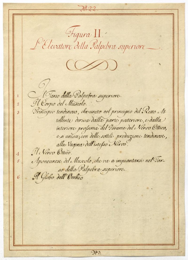 Der Text ist die ergänzende Beschreibung in italienischer Sprache zum anatomischen Wachsmodell der Augenmuskeln.