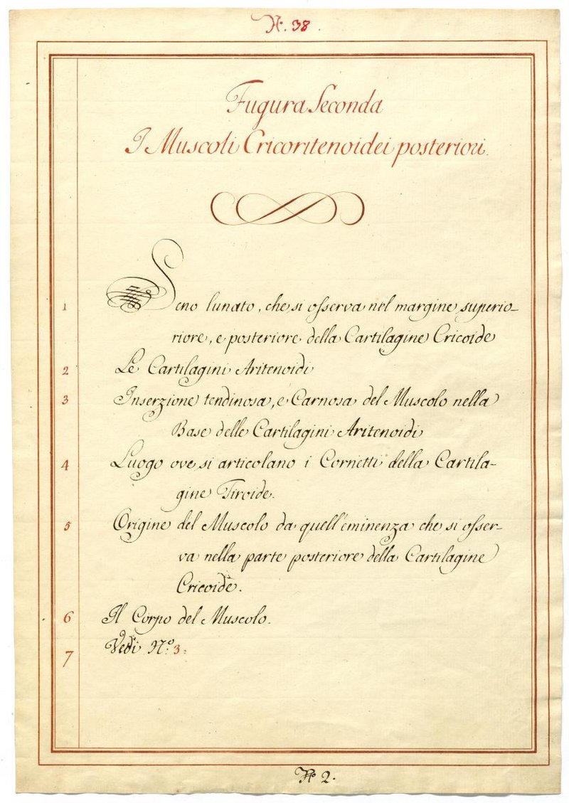 Der Text ist die ergänzende Beschreibung in italienischer Sprache zum anatomischen Wachsmodell der Kehlkopf- und Rachenmuskulatur.