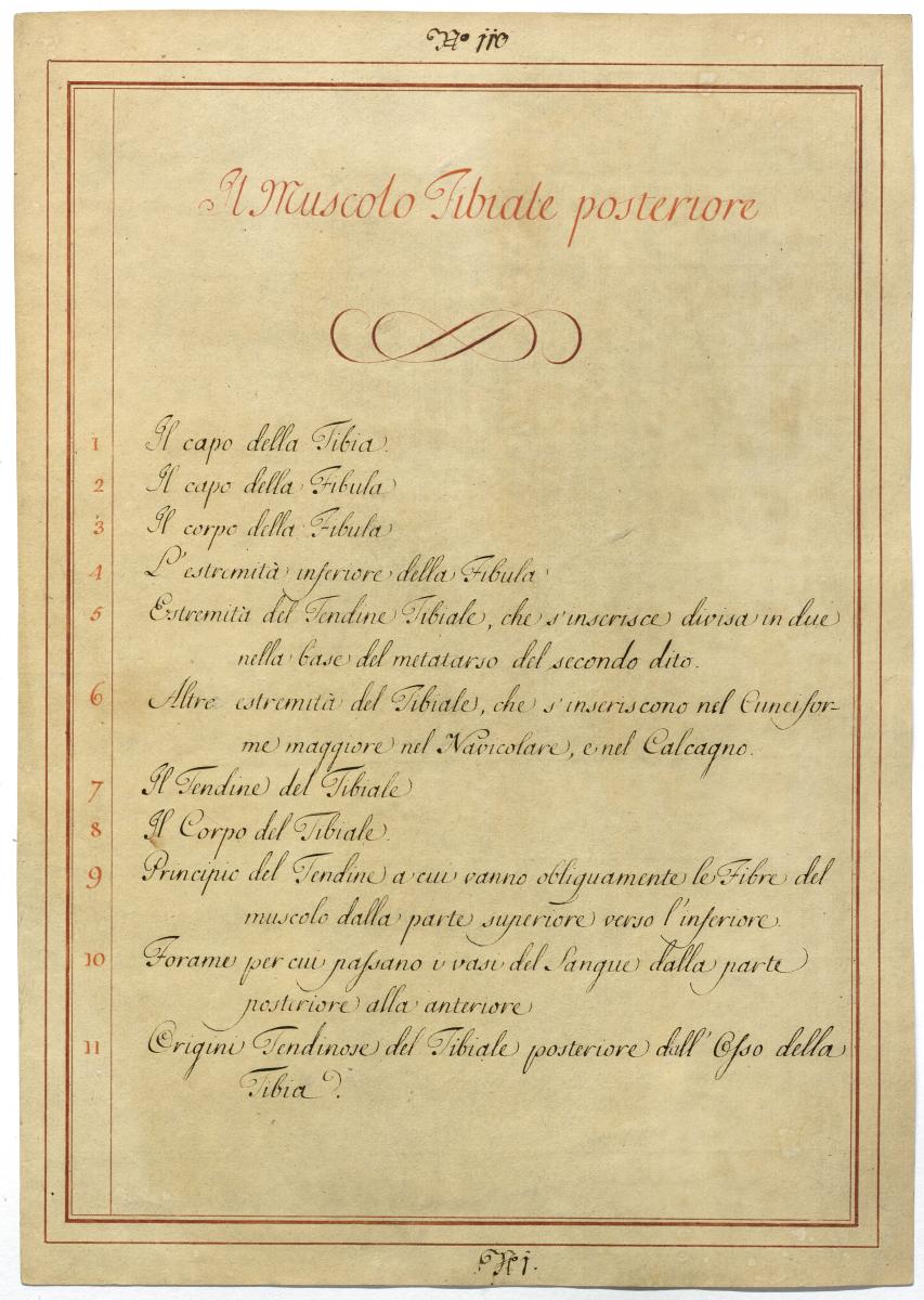 Der Text ist die ergänzende Beschreibung in italienischer Sprache zum anatomischen Wachsmodell der Schienbeinmuskulatur.