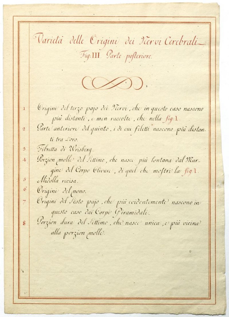 Der Text ist die ergänzende Beschreibung in italienischer Sprache zum anatomischen Wachsmodell der Hirnbasis.
