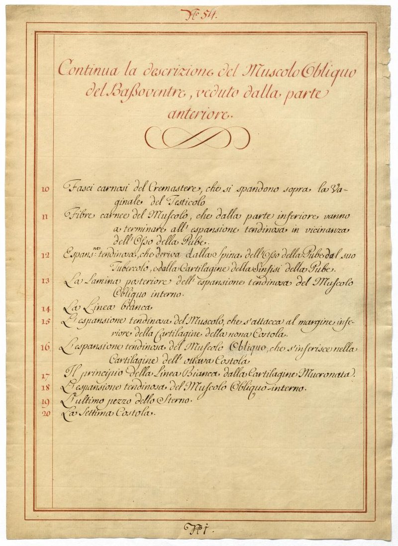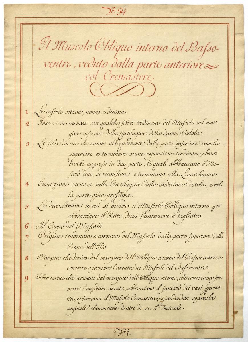 Der Text ist die ergänzende Beschreibung in italienischer Sprache zum anatomischen Wachsmodell der Bauchmuskulatur.
