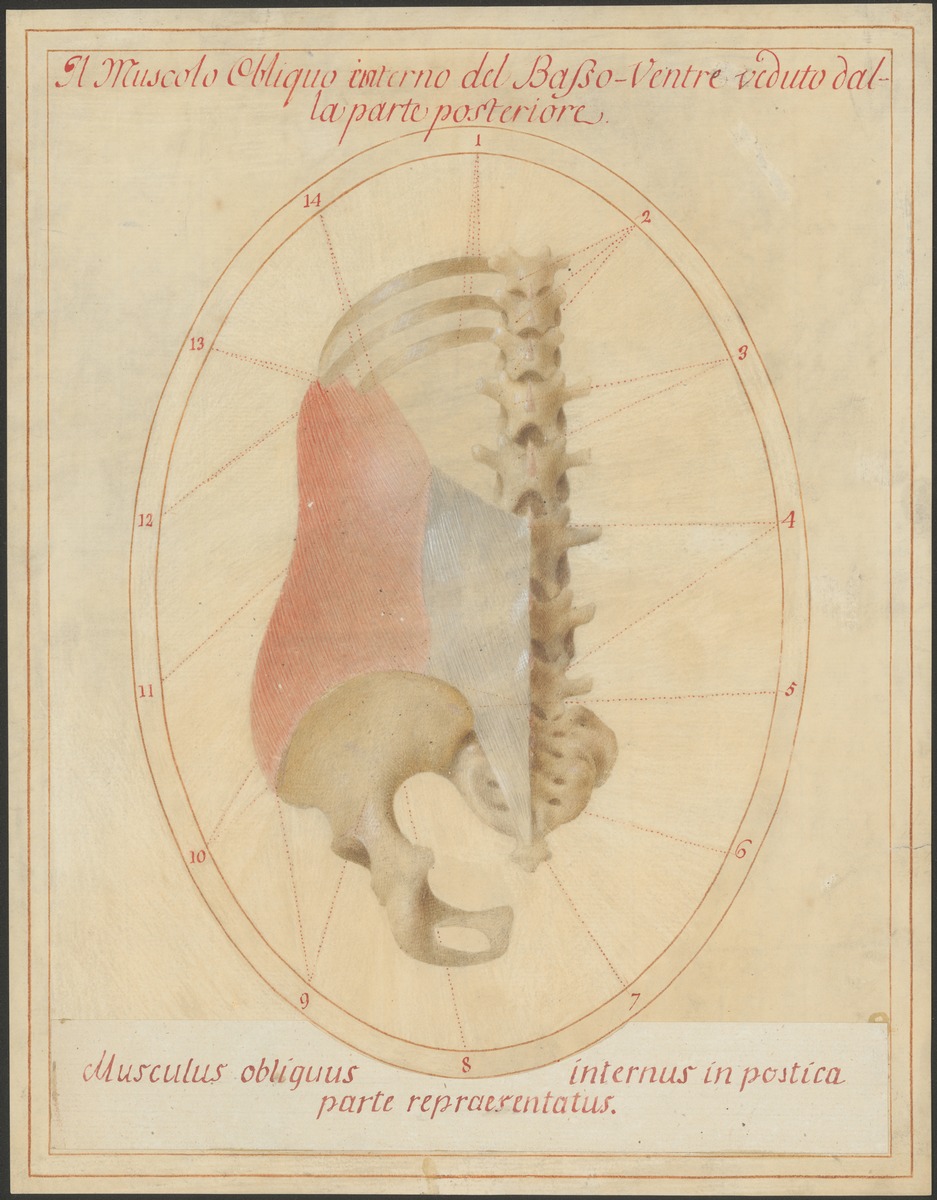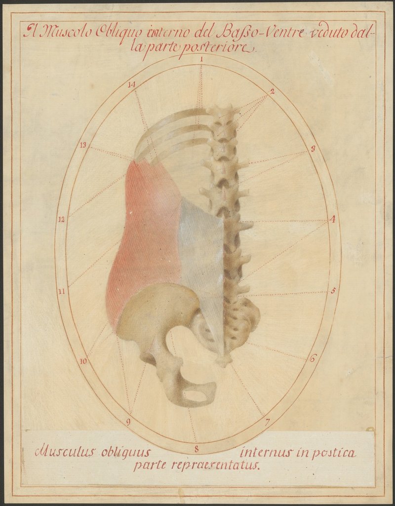 10.-12. Brustwirbel mit Rippen der linken Seite, Lendenwirbelsäule, Kreuzbein (Os sacrum) und linker Beckenknochen von hinten. Musculus obliquus internus abdominis.
