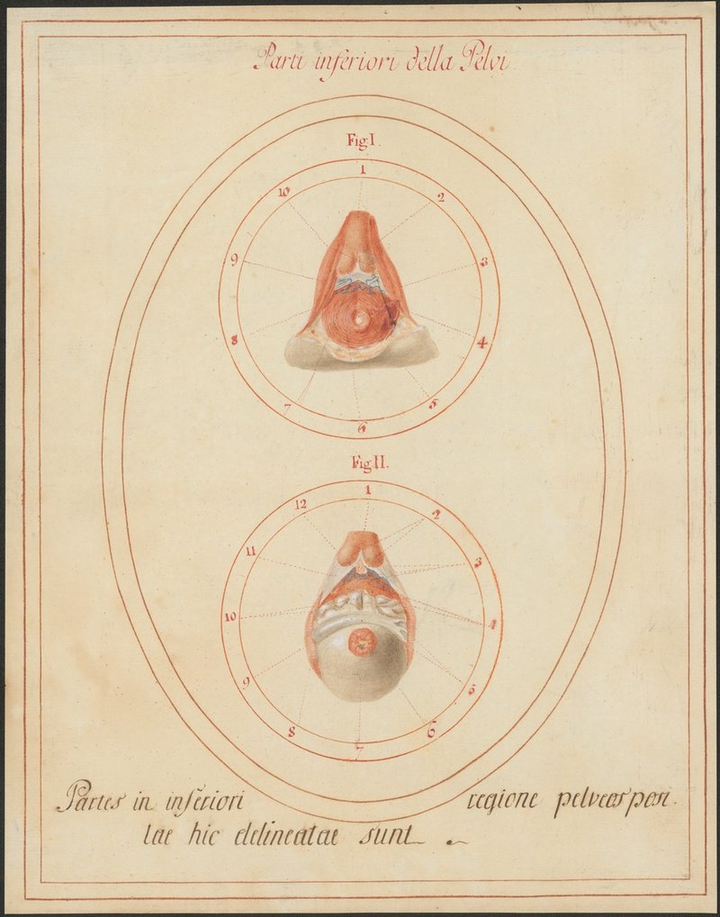 Fig 1: 221/1: Der innere und der äußere Schließmuskel des Afters (Musculus sphincter ani internus und Musculus sphincter ani externus) und der Musculus transversus perinei profundus, der Musculus isehiocavernosus und Venengeflechte (Plexus venosi). Fig. 2: 221/2: Der Musculus levator ani, der innere Schließmuskel des Afters (Musculus sphincter ani internus), die Vorsteherdrüse (Prostata), die Samenbläschen (Vesiculae seminales) und das Ligamentum puboprostaticum.