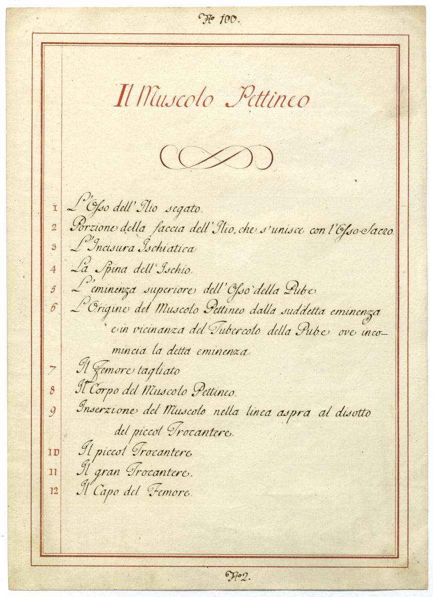 Der Text ist die ergänzende Beschreibung in italienischer Sprache zum anatomischen Wachsmodell der Adduktorenmuskulatur.