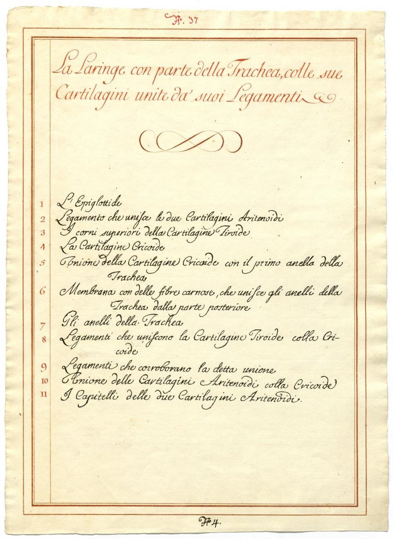 Der Text ist die ergänzende Beschreibung in italienischer Sprache zum anatomischen Wachsmodell der Kehlkopfmuskulatur.