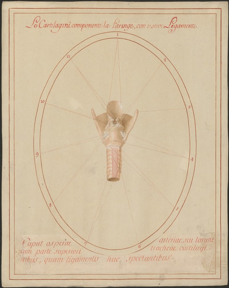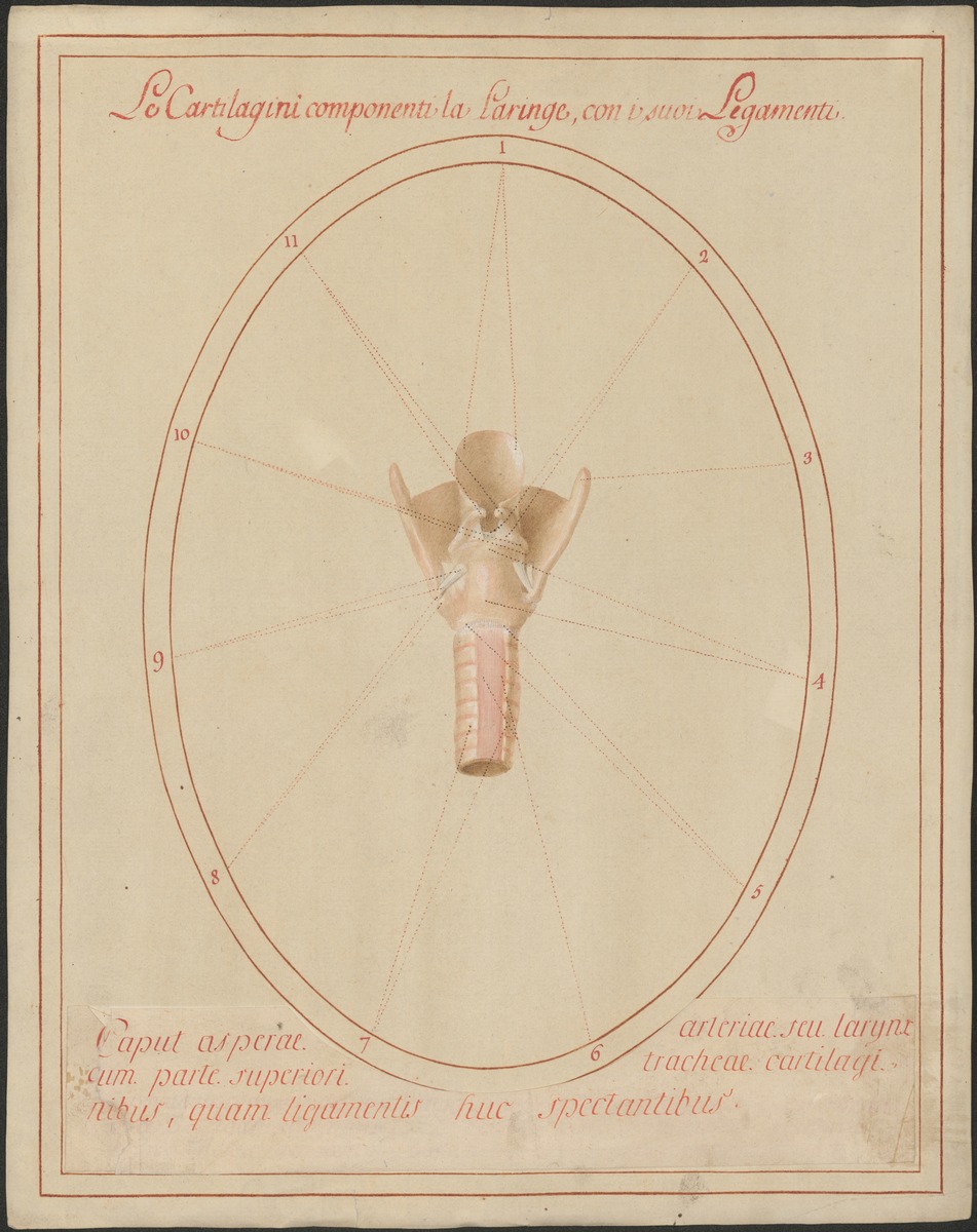 1. Isoliertes Modell des Kehlkopfs (Larynx) mit dem Anfang der Luftröhre (Trachea) und seinem Bandapparat von dorsal: Ligamentum crico-arytaenoideum posterius, Ligamentum cricotracheale, Ligamentum cricothyreoideum.