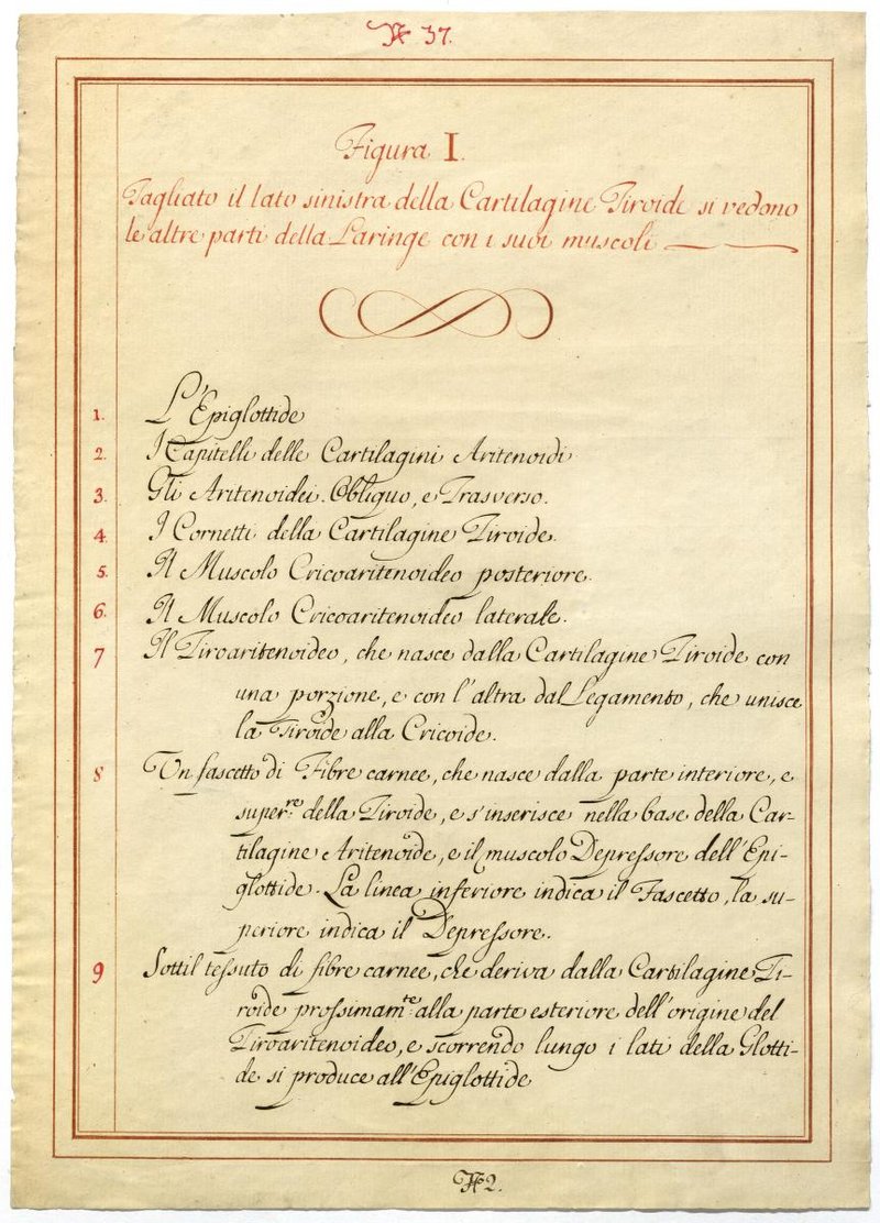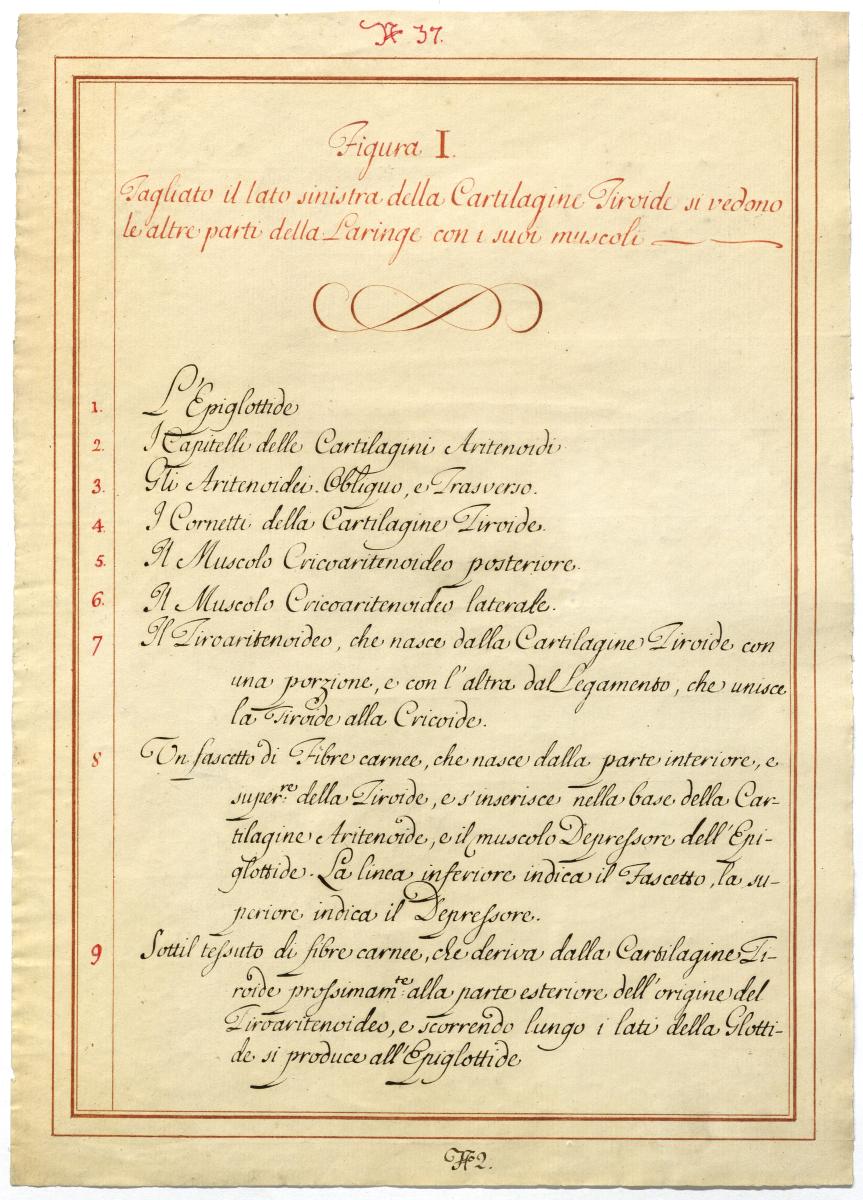 Der Text ist die ergänzende Beschreibung in italienischer Sprache zum anatomischen Wachsmodell der Kehlkopfmuskulatur.