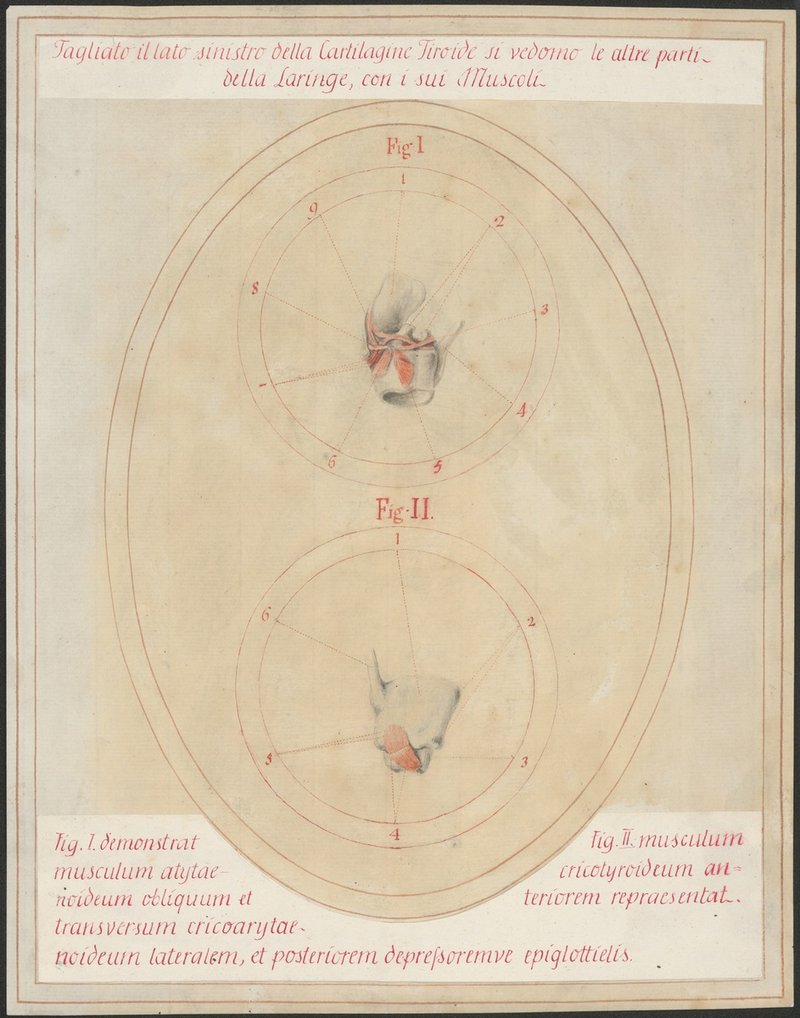 Fig. 1: 34/2: Isoliertes Modell des Kehlkopfs nach Entfernung der linken Schildknorpelhälfte (Cartilago thyreoidea) von der linken Seite: Musculus arytaenoideus obliquus, Musculus arytaenoideus transversus, Musculus cricoarytaenoideus posterior, Musculus cricoarytaenoideus lateralis, Musculus thyroarytaenoideus mit Pars thyreoepiglottica und der Pars aryepiglottica. Fig 2: 34/7: Isoliertes Modell der rechten Schildknorpelhälfte und Ringknorpelhälfte: Musculus cricothyreoideus.
