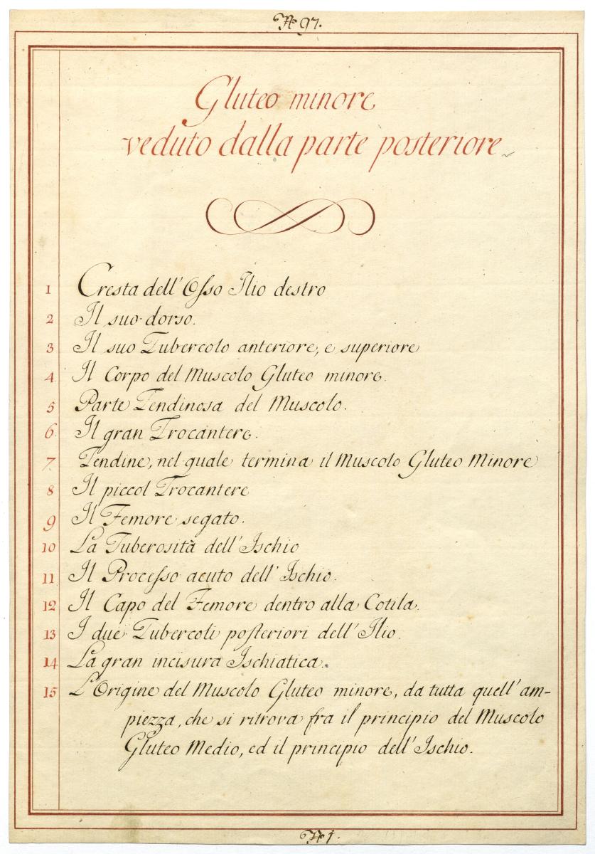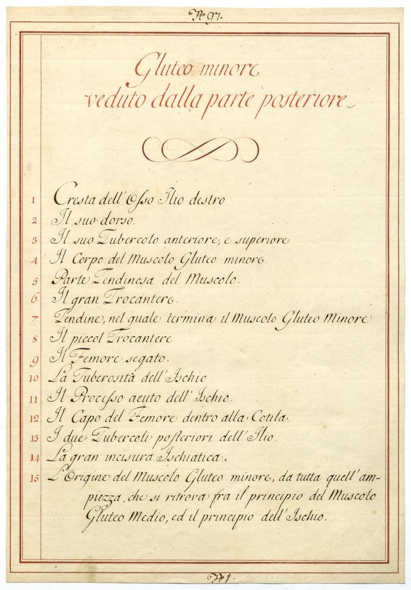 Der Text ist die ergänzende Beschreibung in italienischer Sprache zum anatomischen Wachsmodell der Hüftmuskulatur.
