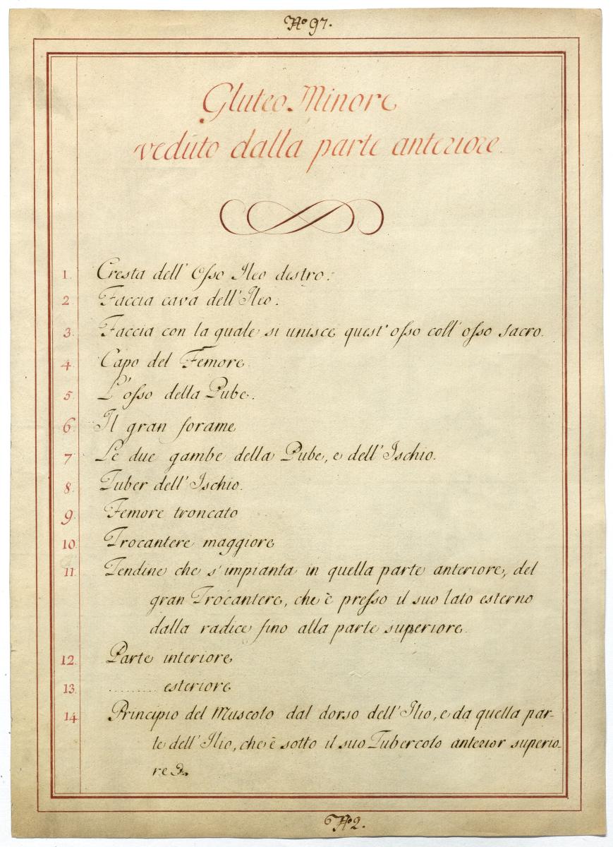 Der Text ist die ergänzende Beschreibung in italienischer Sprache zum anatomischen Wachsmodell der Hüftmuskulatur.