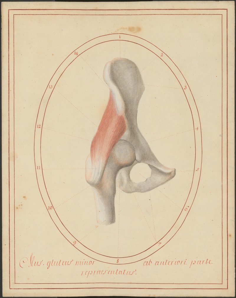 Rechter Beckenknochen (Os coxae) und rechter proximaler Oberschenkelknochen (Femur) von der Seite. Musculus glutaeus minimus.