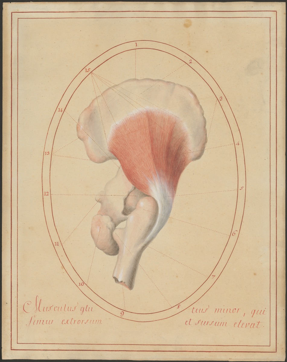 Rechter Beckenknochen (Os coxae) und rechter proximaler Oberschenkelknochen (Femur) von der Seite. Musculus glutaeus minimus.