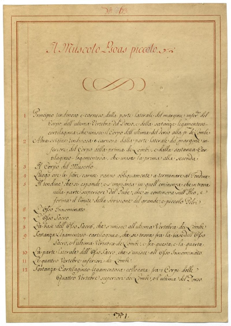 Der Text ist die ergänzende Beschreibung in italiensicher Sprache zum anatomischen Wachsmodell der Hüftmuskulatur.