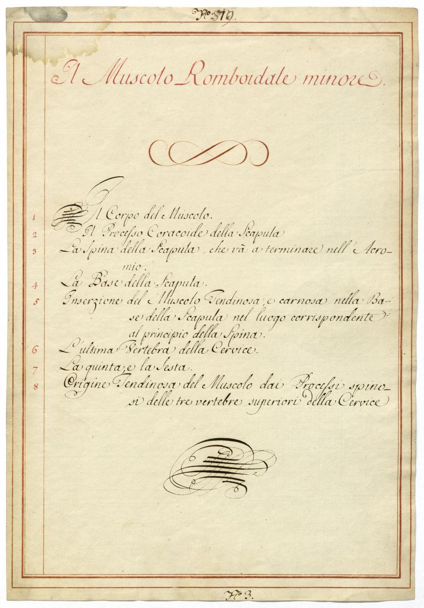 Der Text ist die ergänzende Beschreibung in italienischer Sprache zum anatomischen Wachsmodell der Schulterblattmuskulatur.