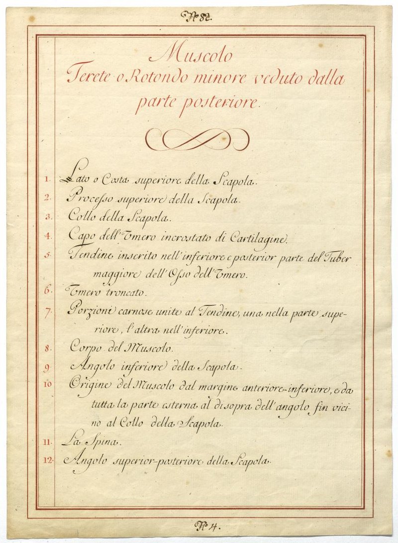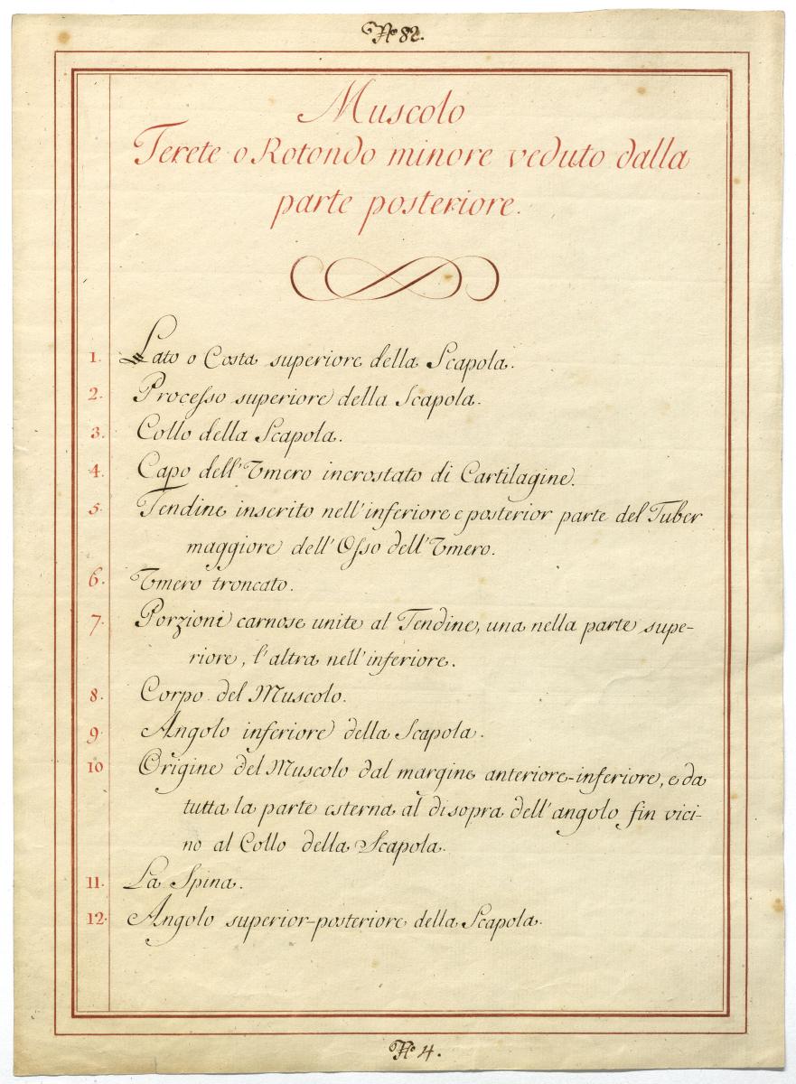Der Text ist die ergänzende Beschreibung in italienischer Sprache zum anatomischen Wachsmodell der Schultergürtelmuskulatur.