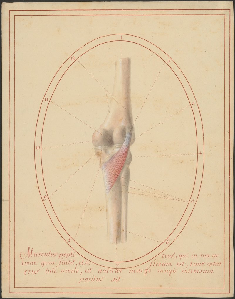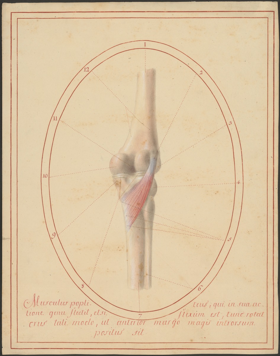 Knochen des Kniegelenks (distaler Oberschenkelknochen (Femur), proximale Unterschenkelknochen – Schienbein (Tibia) und Wadenbein (Fibula)) von hinten. Musculus popliteus.
