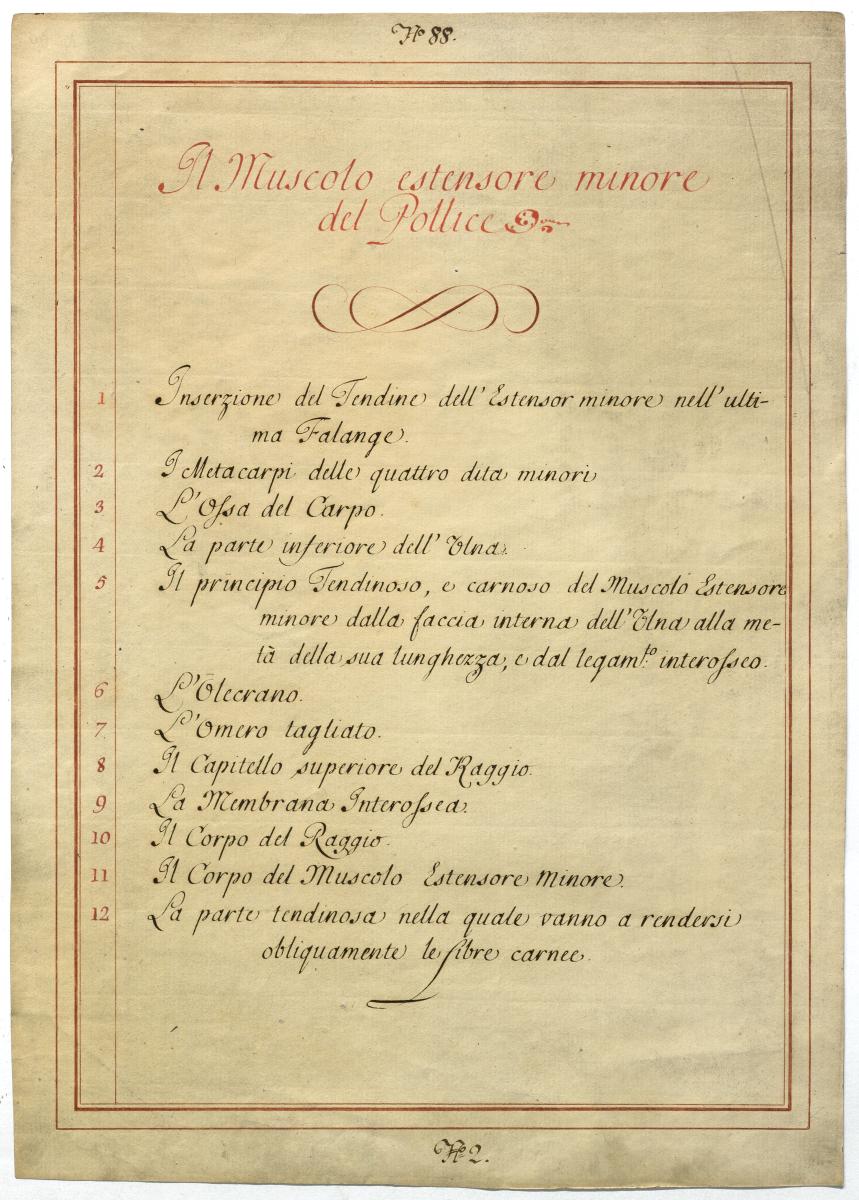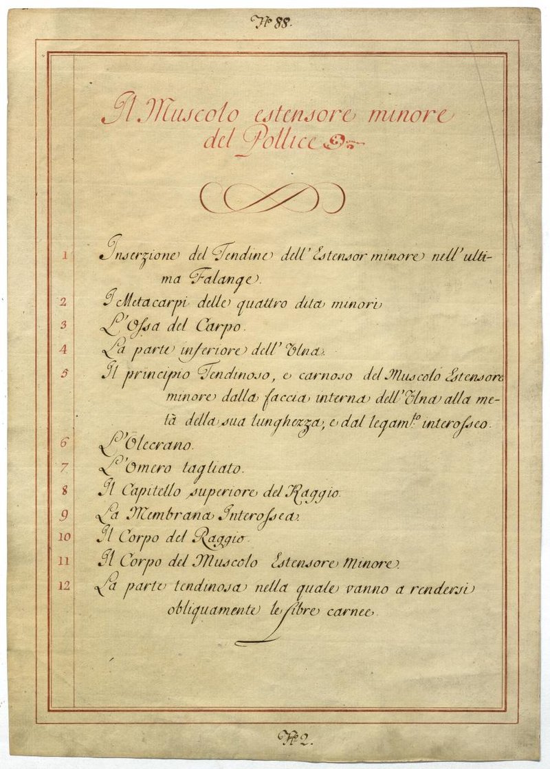 Der Text ist die ergänzende Beschreibung in italienischer Sprache zum anatomischen Wachsmodell der Unterarmmuskeln.