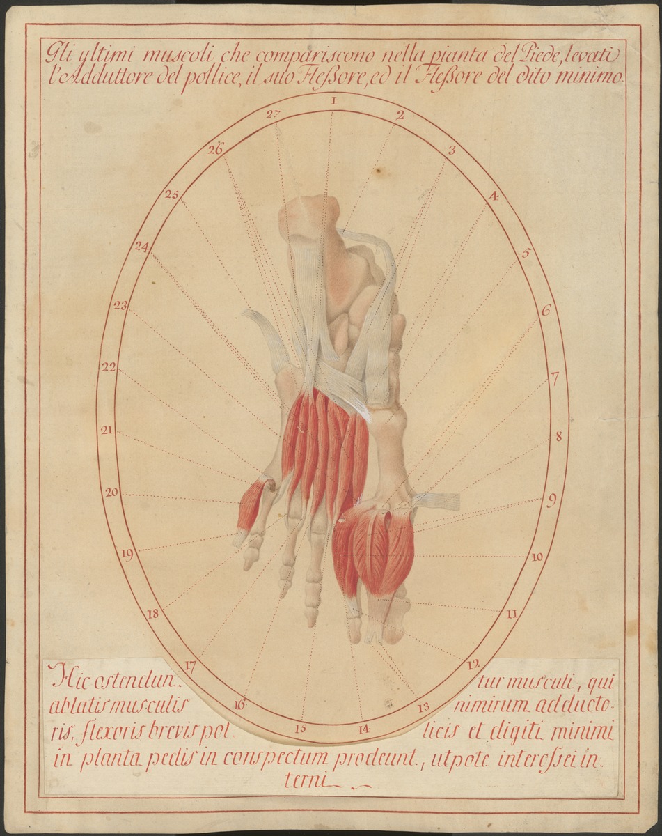 Linker Fuß von plantar, zwei Muskeln des Großzehenballens, Musculus flexor hallucis brevis (kurzer Großzehenbeuger, Musculus adductor hallucis sowie der Musculus flexor digiti minimi brevis (kurzer Kleinzehenbeuger) sind zurückgeschlagen: man sieht die Musculi interossei plantares. Im Mittelfußbereich sind die plantar ansetzenden Muskelsehnen dargestellt.