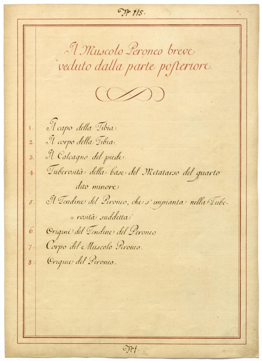 Der Text ist die ergänzende Beschreibung in italienischer Sprache zum anatomischen Wachsmodell der Wadenbeinmuskulatur.