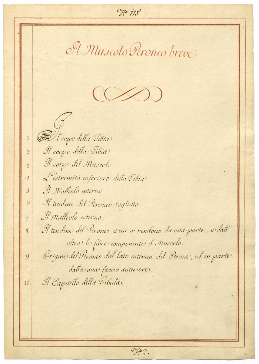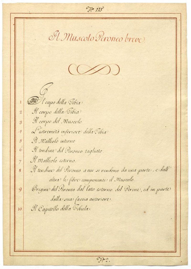 Der Text ist die ergänzende Beschreibung in italienischer Sprache zum anatomischen Wachsmodell der Wadenbeinmuskulatur.