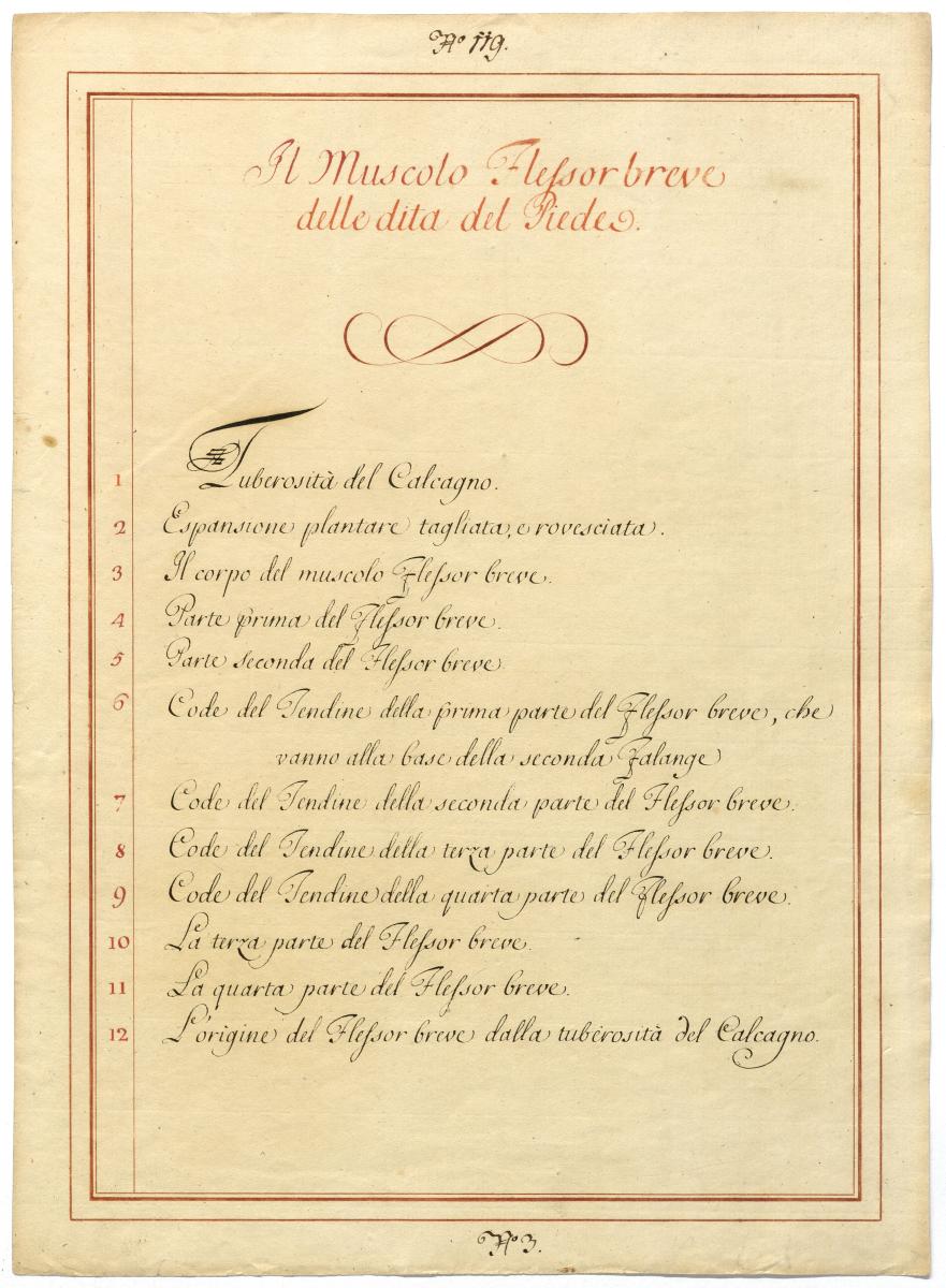 Der Text ist die ergänzende Beschreibung in italienischer Sprache zum anatomischen Wachsmodell der Muskeln der Fußsohle.