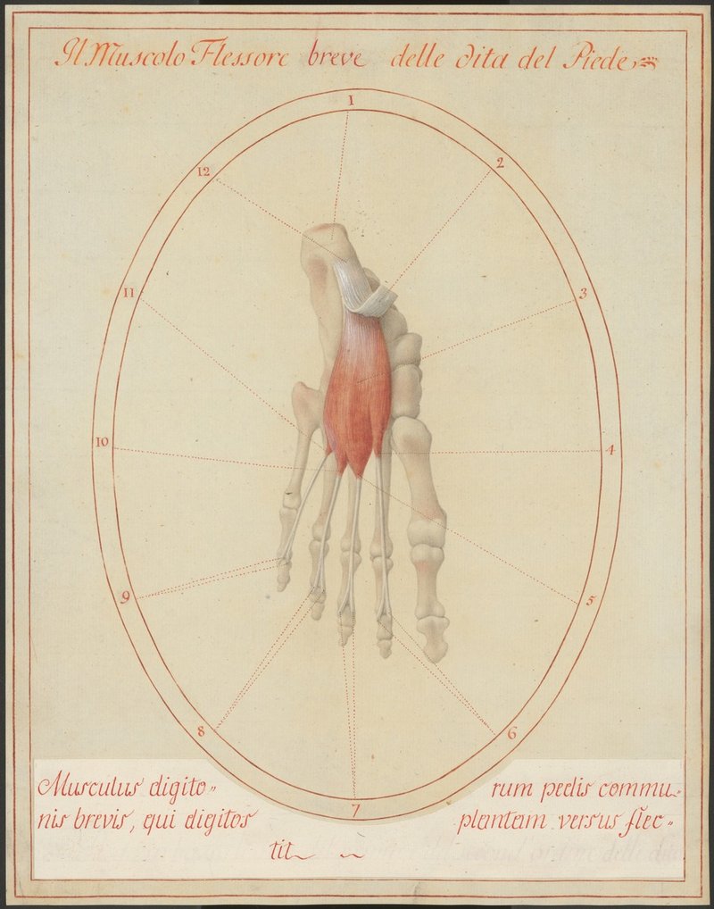Linker Fuß von plantar, Musculus flexor digitorum brevis (kurzer Zehenbeuger) und die zurückgeschlagene Aponeurosis plantaris (Plantarfaszie).