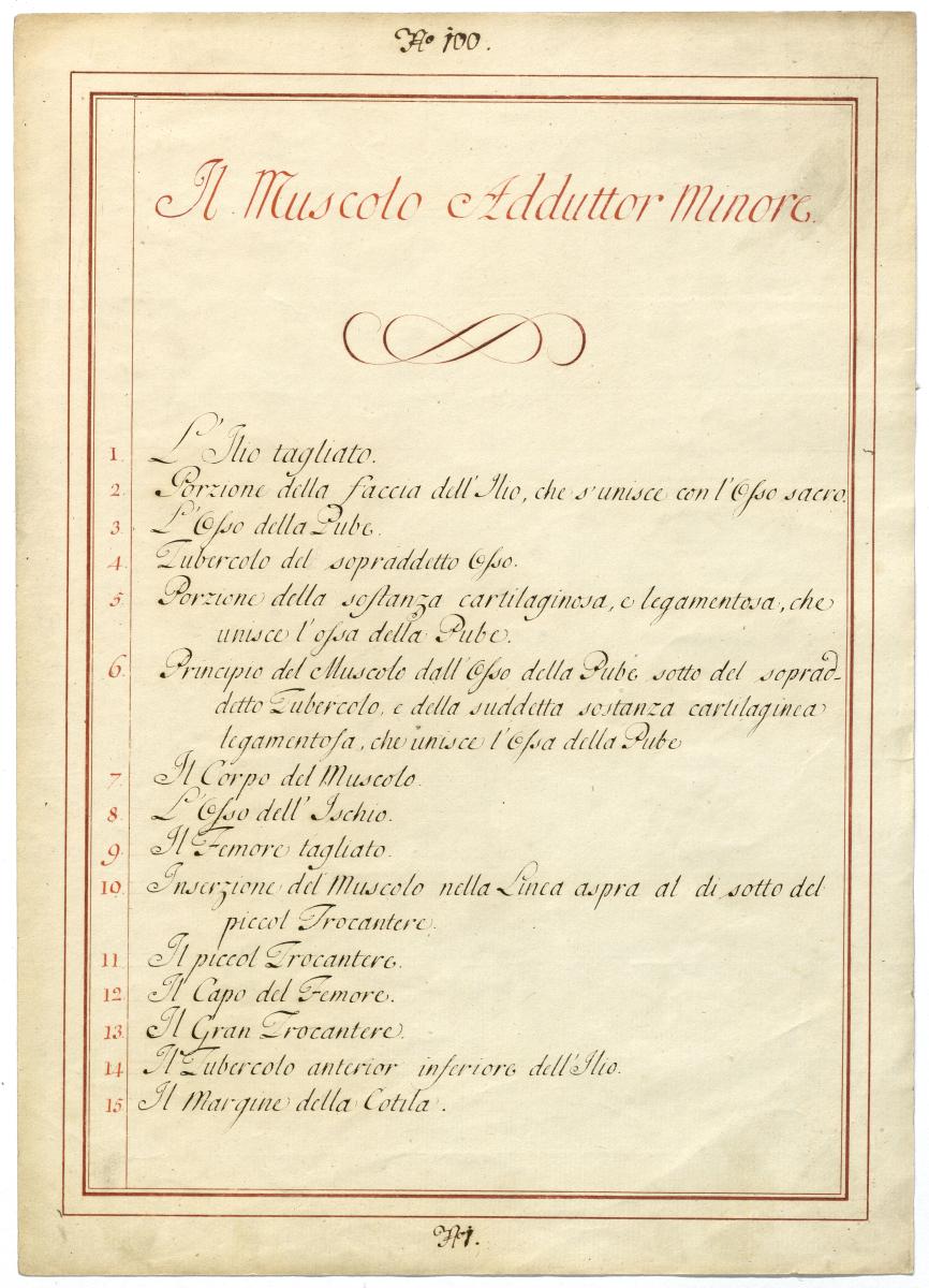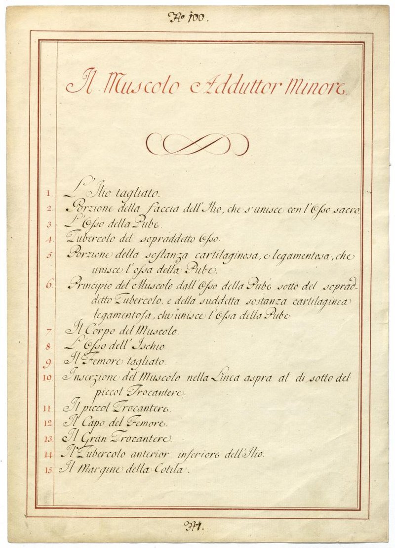 Der Text ist die ergänzende Beschreibung in italienischer Sprache zum anatomischen Wachsmodell der Adduktorenmuskulatur.