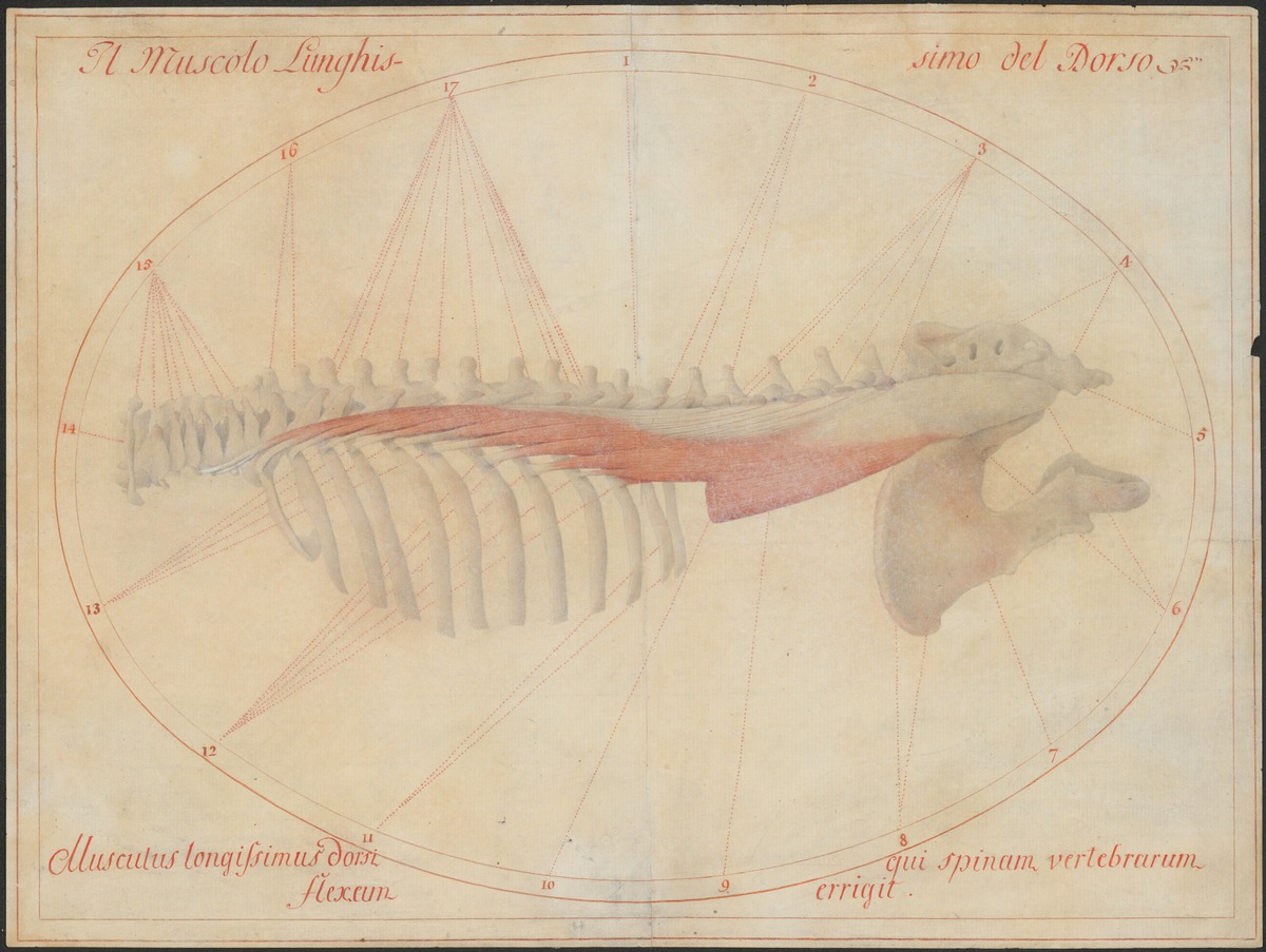 Wirbelsäule bis zum Kreuzbein (Os sacrum) inklusive linkem Beckenknochen (Os coxae) und linkem Brustkorb, von hinten. Musculus longissimus und der im Lendenbereich durchtrennte und teilweise abgetragene Musculus iliocostalis lumborum.