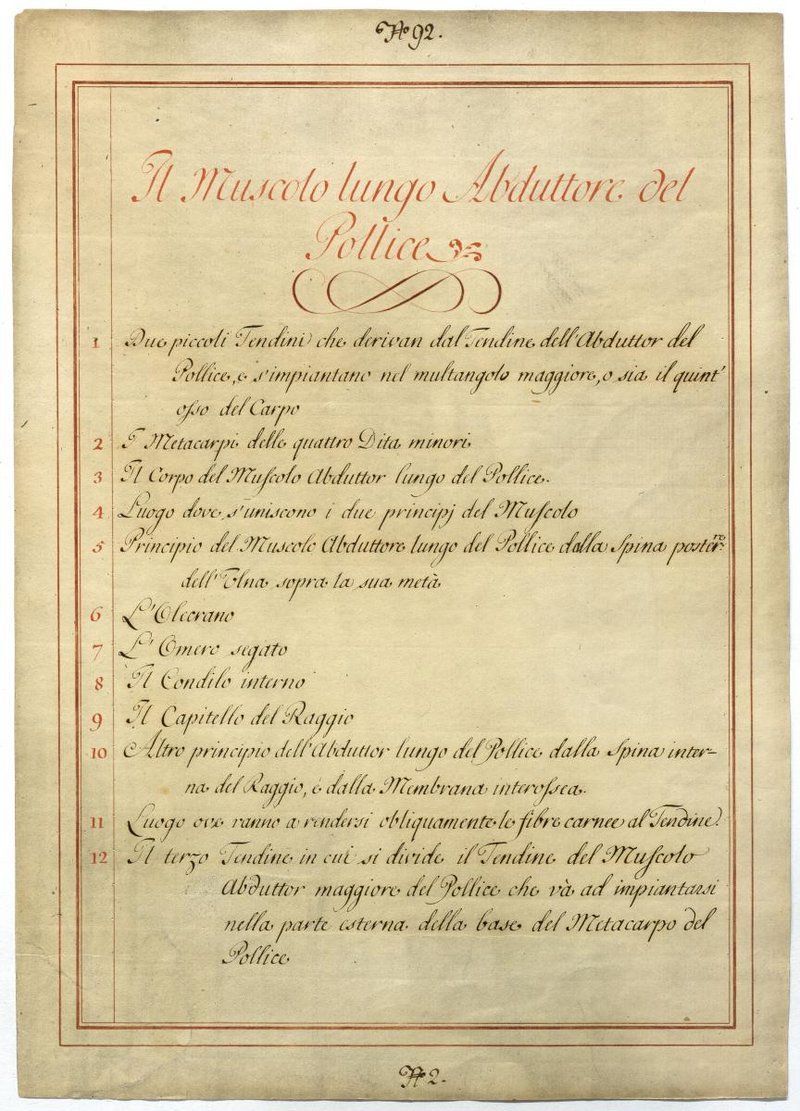Der Text ist die ergänzende Beschreibung in italienischer Sprache zum anatomischen Wachsmodell der Unterarmmuskeln.