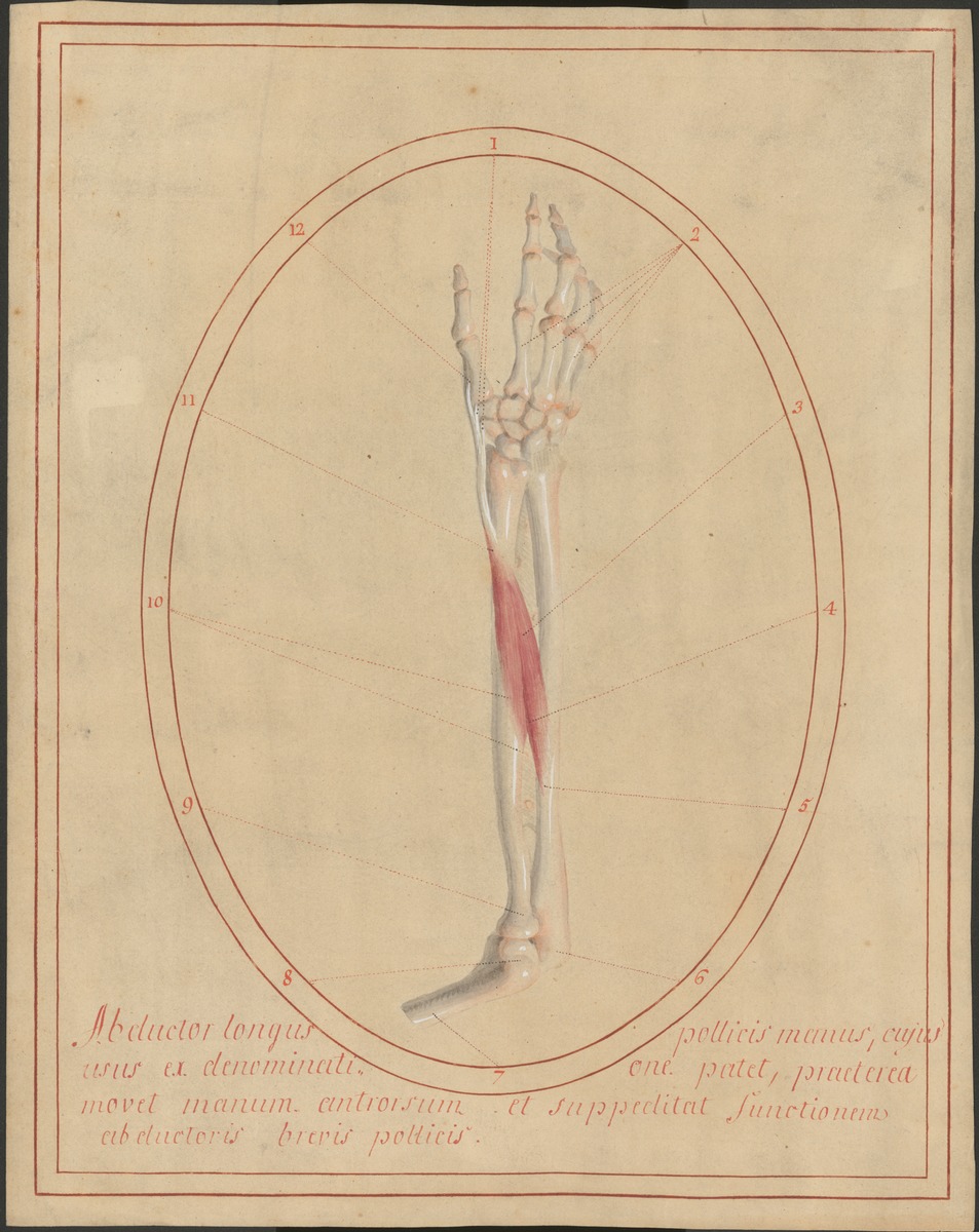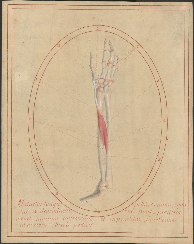 Distaler Oberarmknochen (Humerus), Unterarmknochen – Elle (Ulna) und Speiche (Radius) und Knochen der Hand der rechten Seite von hinten. Musculus abductor pollicis longus.