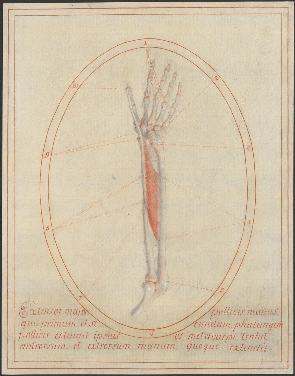 Distaler Oberarmknochen (Humerus), Unterarmknochen – Elle (Ulna) und Speiche (Radius) und Knochen der Hand der rechten Seite von hinten. Musculus extensor pollicis longus (langer Daumenstrecker).