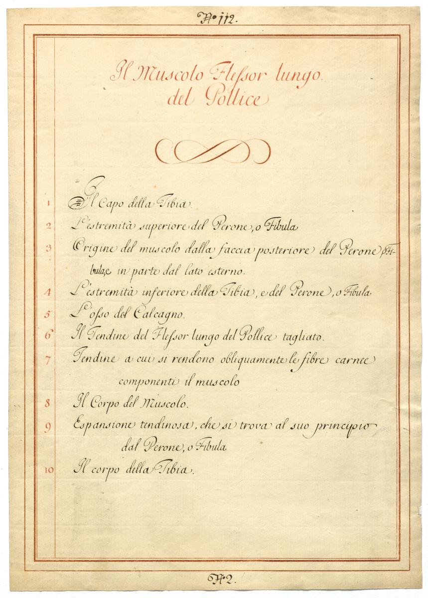 Der Text ist die ergänzende Beschreibung in italienischer Sprache zum anatomischen Wachsmodell der langen Muskeln der Großzehe.