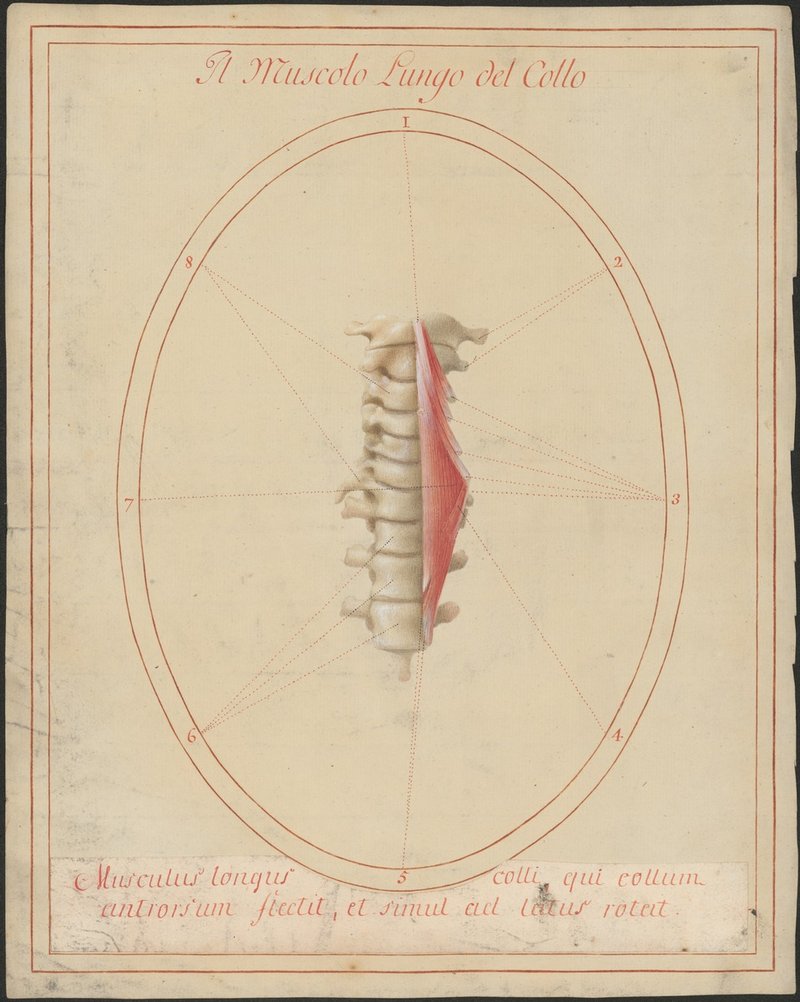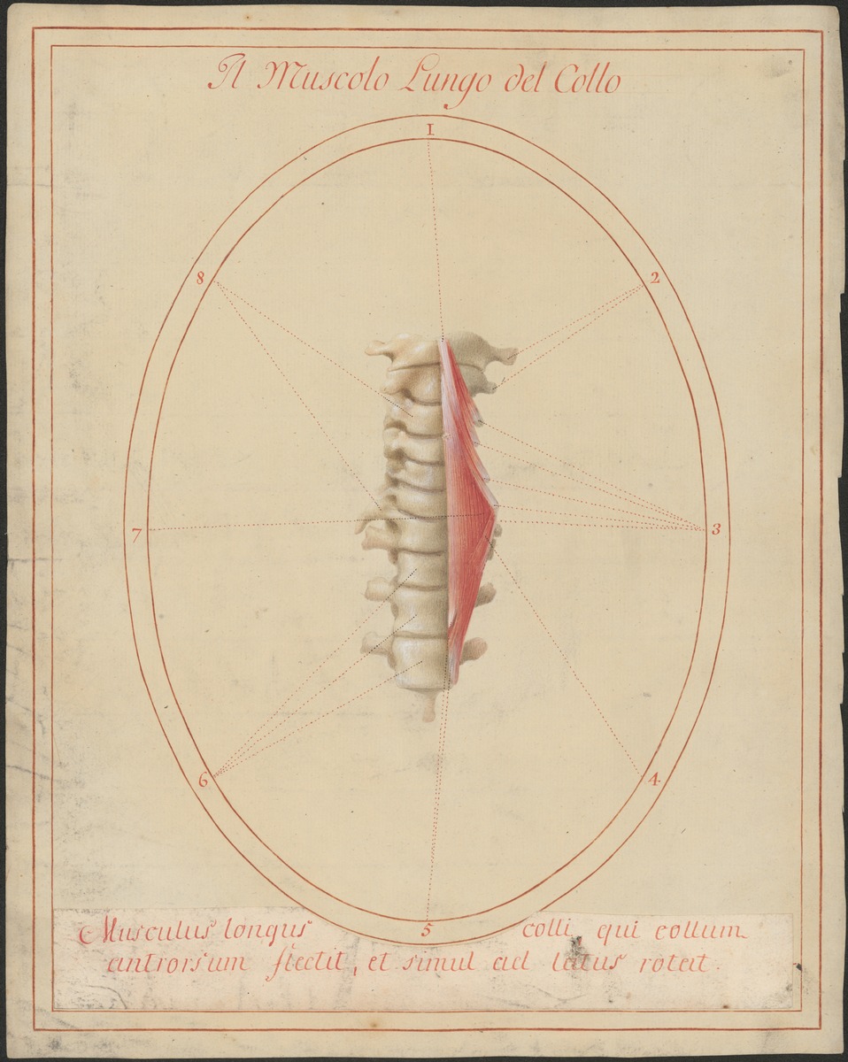 Isoliertes Modell der sieben Halswirbeln und der ersten drei Brustwirbel von vorne. Linker Musculus longus colli.